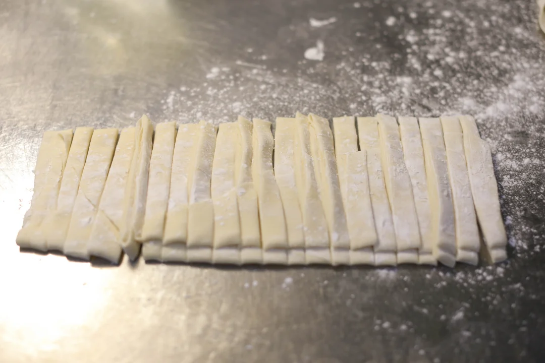 中筋面粉500克 清水220克 蛋清15克 食盐3克 1:和成面团,饧发15分钟,面团变得光滑,开始擀面。 2:擀成面片,折叠切成条即可。 防止粘连可以用玉米淀粉、和玉米面,最好不要用普通白面。