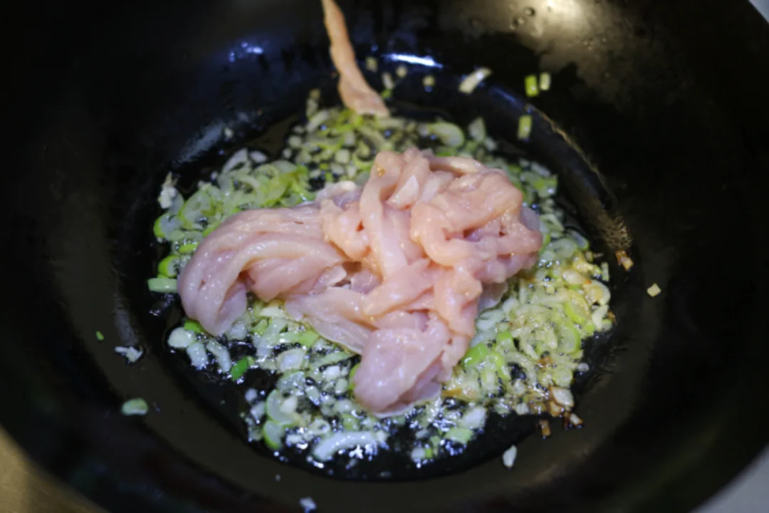 所需材料:鸡胸肉切片再切丝,葱姜切末,两包榨菜丝,青蒜末