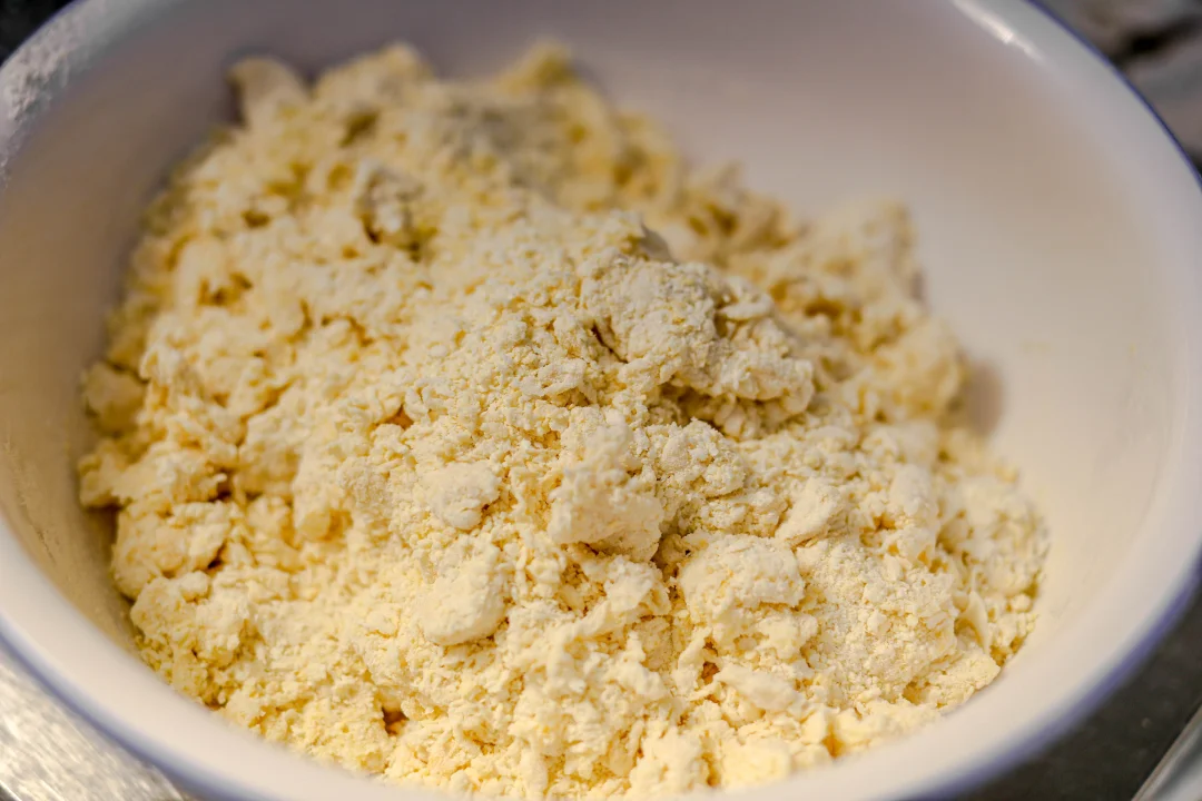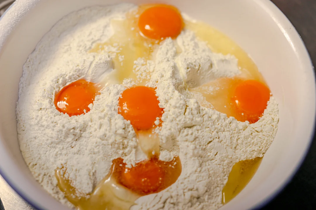 普通的中筋面粉,里面加入新鲜的鸭蛋和少许的食盐,顺着一个方向,慢慢搓成面絮状态即可。也可以根据自己的喜好揉成面团。因为我压面条的方法一直延续我妈妈的做法,基本就是絮状放入压面机,来回反复压就会成片状,最后出面即可。