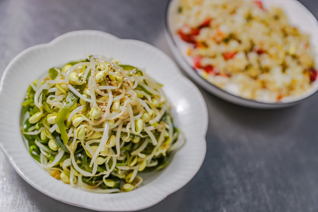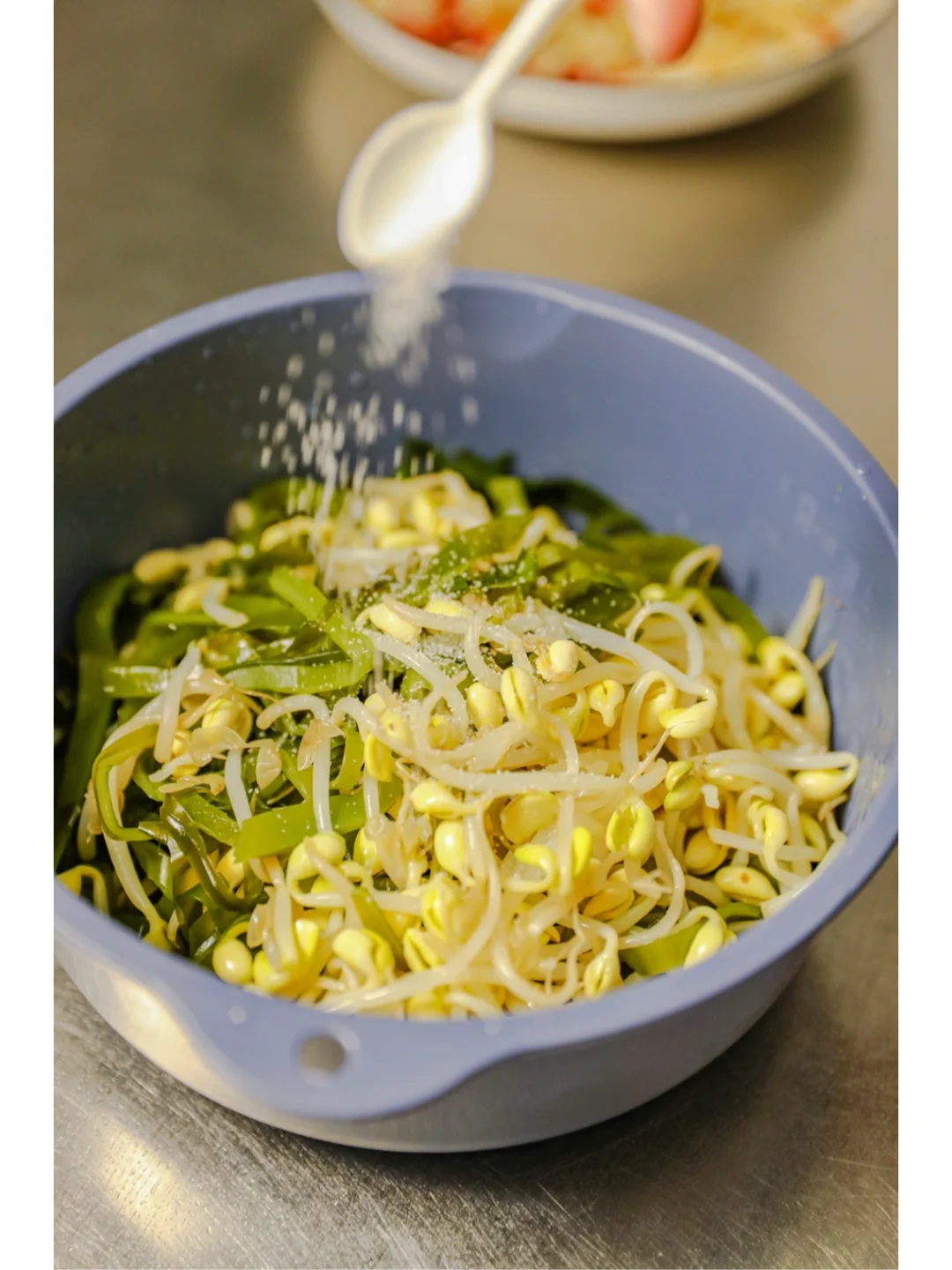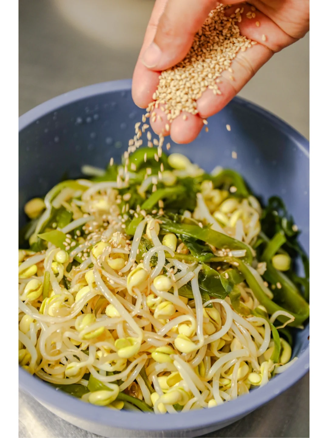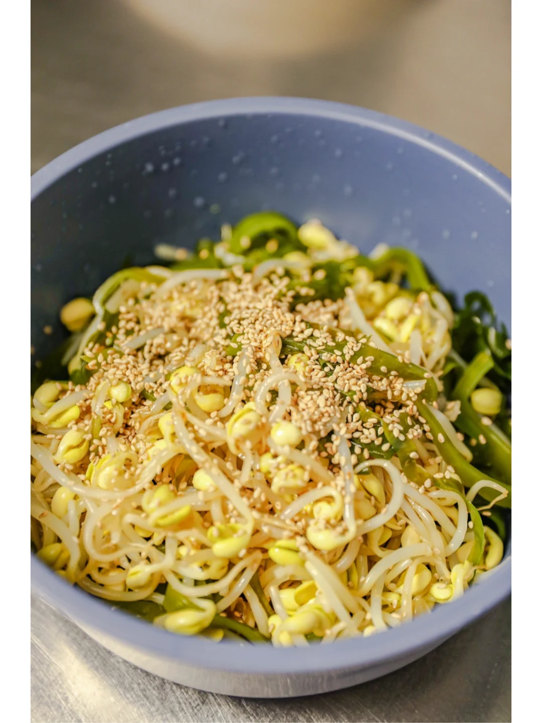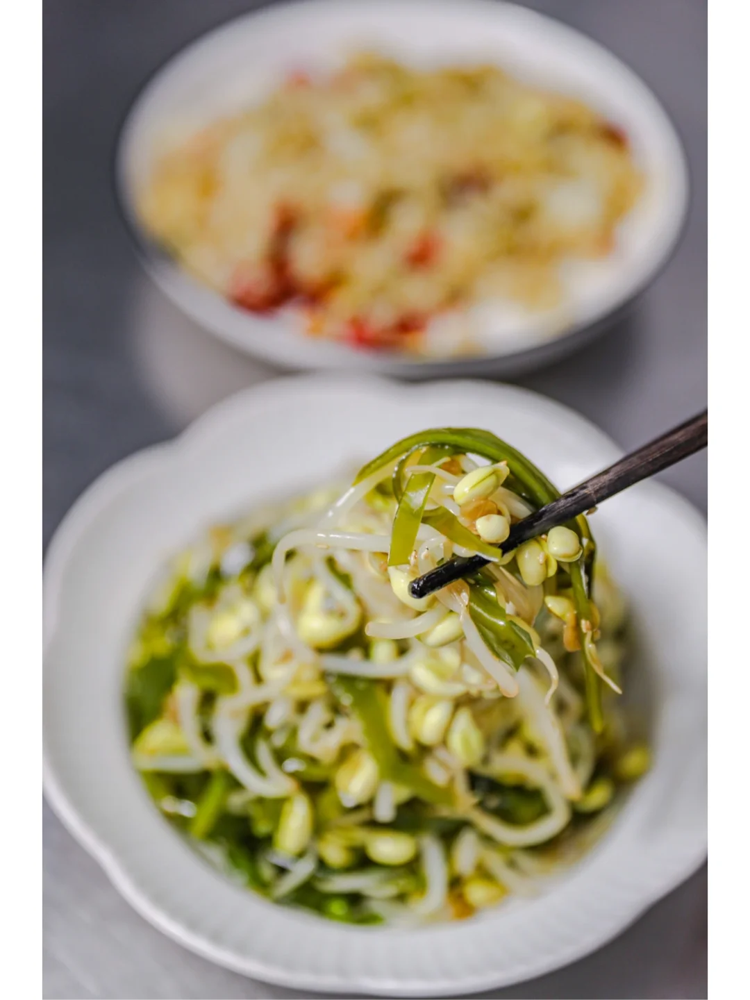 ⭕️2.黄豆芽摘干净之后,同样也是用热水汆烫一下,过凉水,沥干水分。