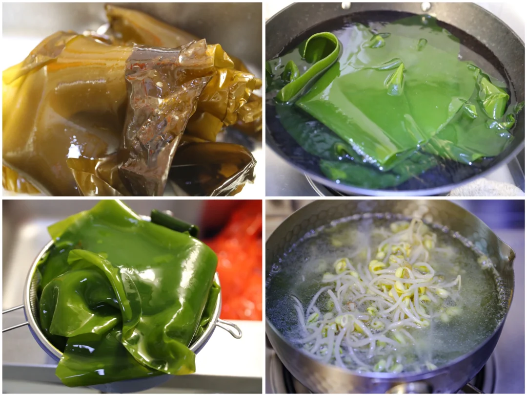 ⭕️1.大张海带切成小段,然后切成丝,放入热水中汆烫几十秒即可捞出。用清水冲洗掉表面的粘液即可。