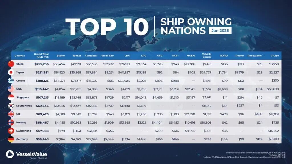 本年度榜单折射出三条清晰主线:集装箱资产价值再度走强并重塑“船东国”排名;MSC驱动的瑞士资产扩张改变欧洲内部座次;以及美国邮轮资产强势抬升,让“非传统商船主线”的高价值板块在排名中更具决定性。