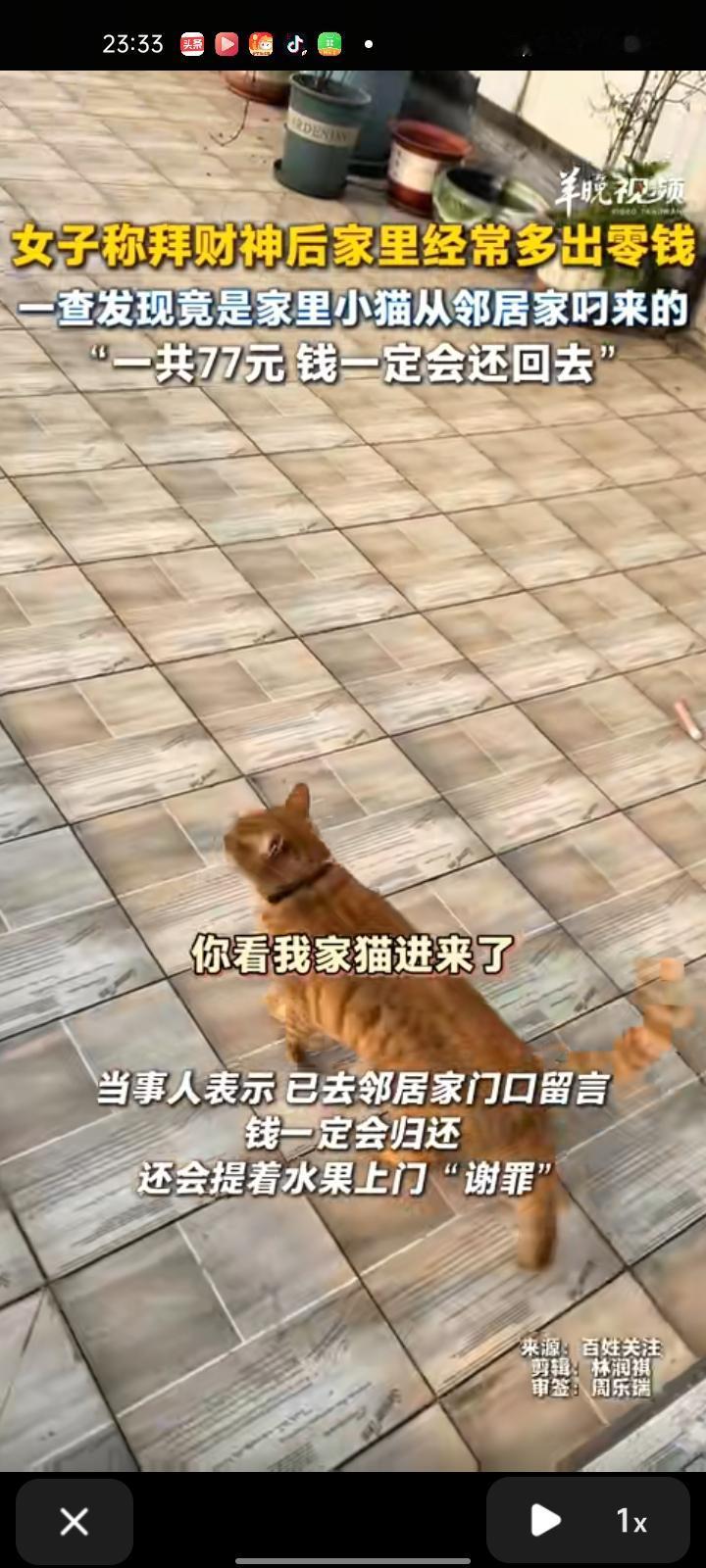 别人家的猫粘人卖萌,这只猫直接硬核“招财”,拜完财神的buff算是叠满了! 2月9日,四川成都。女子发视频称,自己去拜完财神后,家里莫名多了一些零钱,一查才发现自家的猫从邻居家干的。截至2月6日,已清点出“赃款”77元。目前已去邻居家留言,钱一定会归还,还会提着水果上门谢罪。