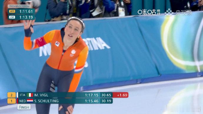 速度滑冰女子1000米决赛,第一组荷兰名将舒尔廷出战,滑出1分15秒46。