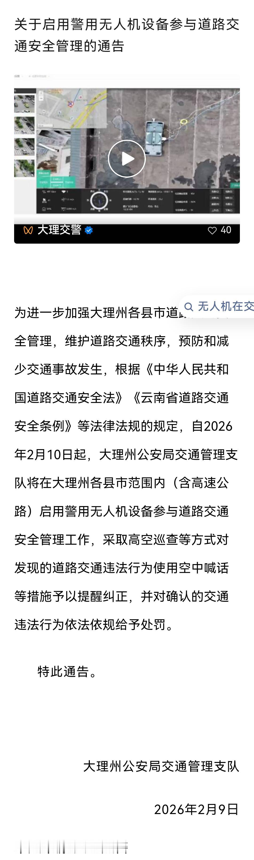 大理州发布通告:将启用无人机助力交通管理 《关于启用警用无人机设备参与道路交通安全管理的通告》 为进一步强化大理州各县市道路交通安全管理,维护良好的道路交通秩序,预防并减少交通事故的发生,依据《道路交通安全法》《云南省道路交通安全条例》等法律法规,自2026年2月10日起,大理州公安局交通管理支队将在大理州各县市范围(含高速公路)启用警用无人机设备,参与道路交通安全管理工作。 届时,将通过高空巡查等方式,对发现的道路交通违法行为采用空中喊话等措施予以提醒纠正,对确认的交通违法行为也将依法依规进行处罚。