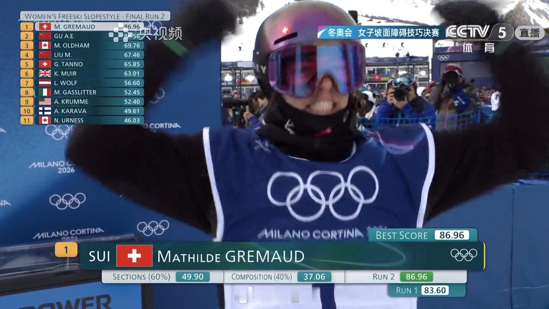 2026年米兰科尔蒂纳冬奥会 格雷穆德86.96!超过谷爱凌0.38分最后一轮决战来了!