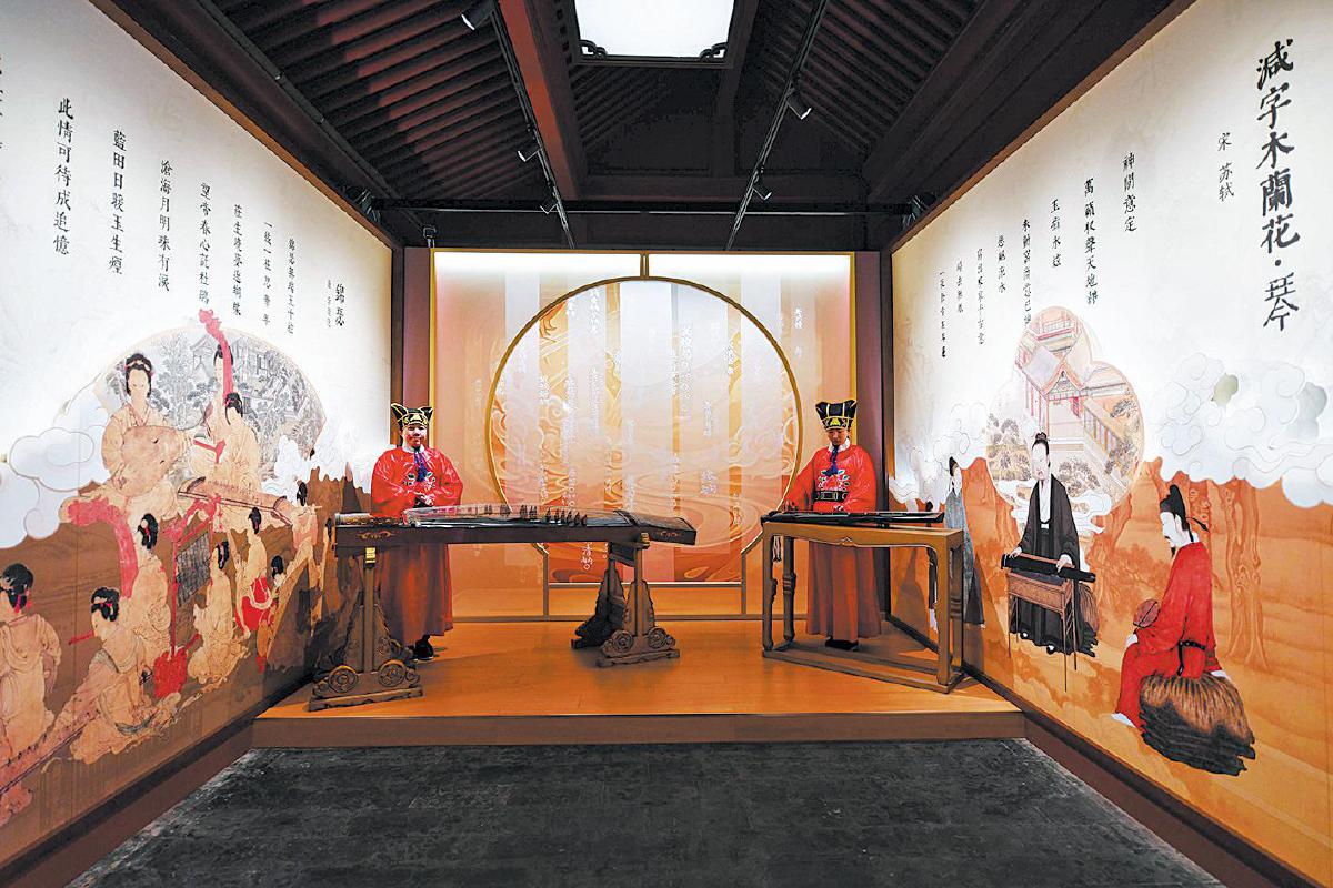 步入展厅,“华夏正声”板块追溯中和韶乐的历史脉络,从周代雅乐到明初定名,从祭天盛典到朝会宴飨,清代宫廷绘画与多媒体触摸屏生动还原了韶乐演奏的恢宏场景。