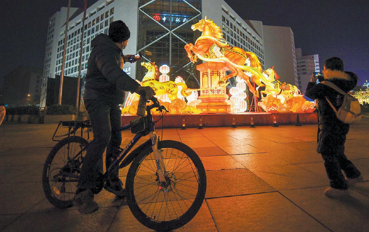 今年的春节景观布置紧扣马年生肖主题。昨晚在西单路口,市民刘女士拿出手机拍摄路边的景观小品,“我出门给孩子买过年的小礼物,看到这里有‘马’,感觉很有过年的氛围,有策马奔腾、蒸蒸日上的节日感。”刘女士说。此处景观小品名叫“万马奔腾”,以昂扬腾跃的骏马群像为核心,周边缀以新春灯笼等元素,吸引了不少市民拍照留念。家住承德的路女士告诉记者,她来北京探望孩子,散步时发现了这处景观小品,于是和老伴一起在“万马奔腾”前合影。