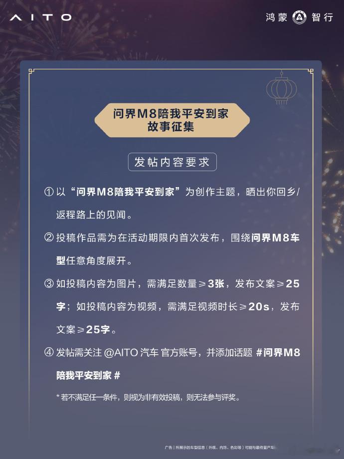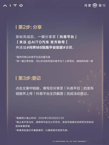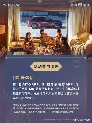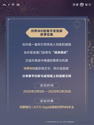 问界M8陪我平安到家2月9日至2月28日,问界M8启动“陪我平安到家”车主故事征集,可通过文字、照片、视频记录春节归家温暖见闻。作为家庭智慧旗舰SUV,问界M8联合新华社、星球研究所,以镜头记录春运团圆之路,守护每一段平安归途。问界M8山河远阔万路归家
