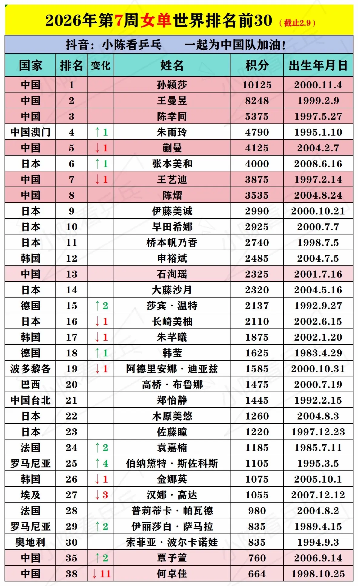 2026第7周乒乒乓球男女单世界排名更新。2026第7周乒乒乓球男女单世界排名更新,列举了前30,中国队继续加油。