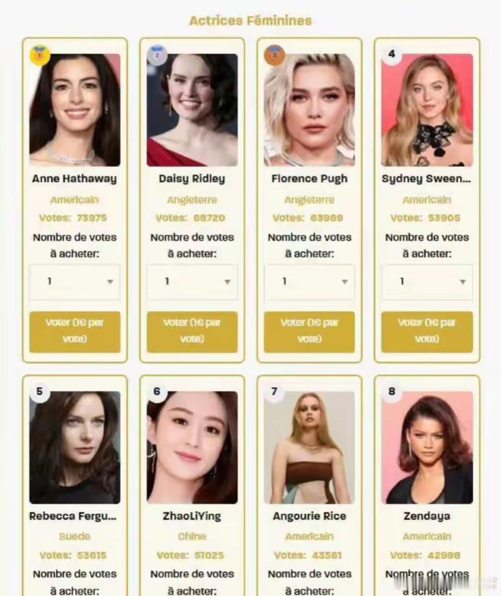 赵丽颖火出国外了 离春节不到十天,欧洲世界电影节公布榜单,赵丽颖拿下全球女演员第6、国内第一。 奖项由120多国观众投票选出,防刷票超公平,她68%票数来自海外,吊打不少国际女星。不靠仙侠功夫,凭现实题材演技出圈,这才是真正的文化输出。恭喜赵丽颖!图片来自网络,侵删。