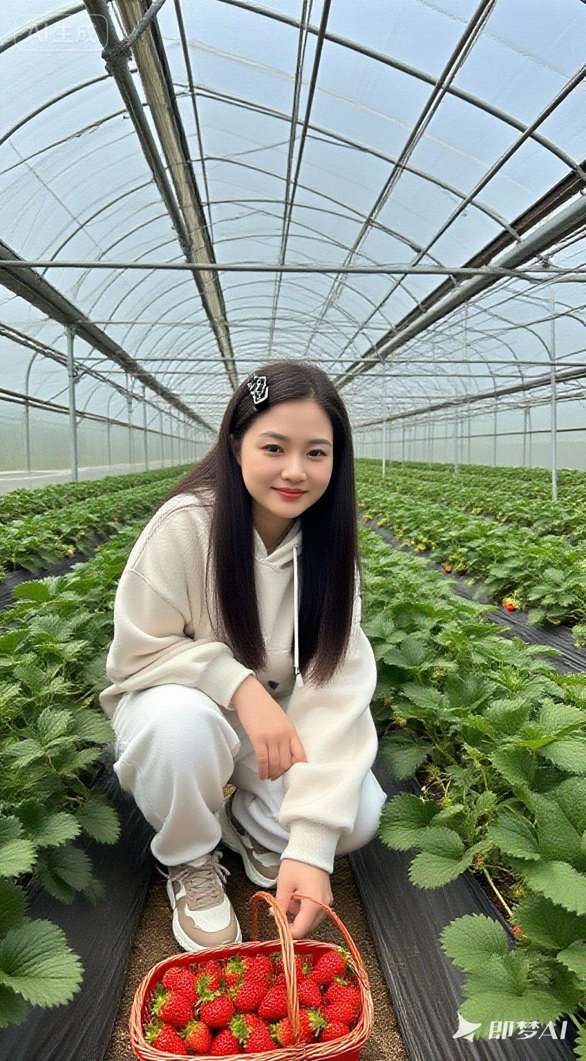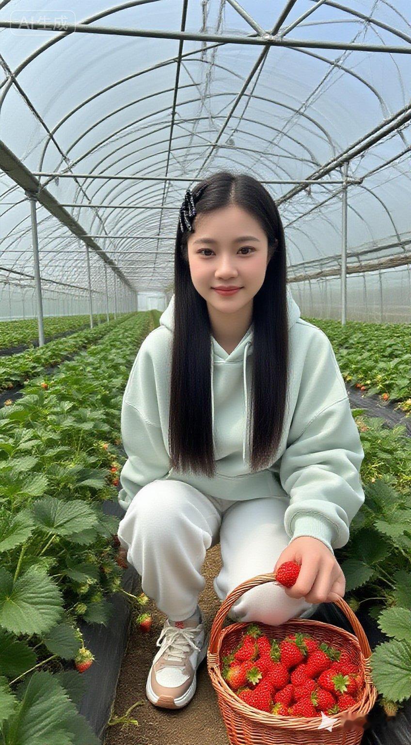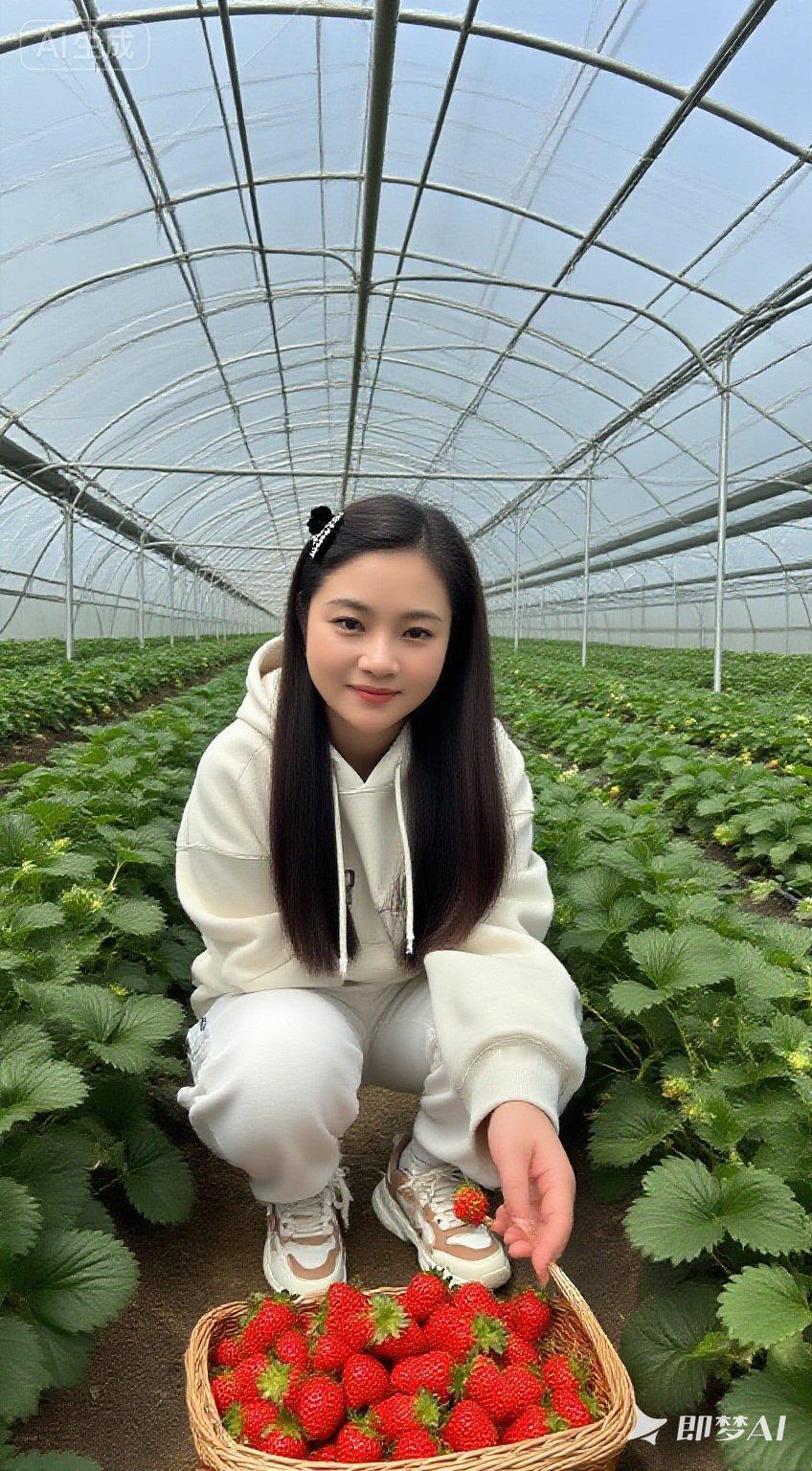 一个女生在温室或草莓农场里采摘草莓,穿着浅色连帽卫衣,纯白色宽松运动裤,浅咖色老