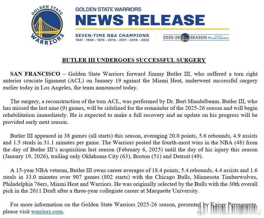 吉米·巴特勒今天在洛杉矶成功接受手术,球队表示,将在“下赛季初”公布他的恢复情况。