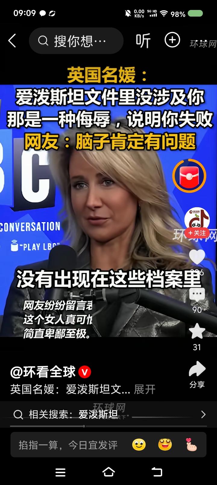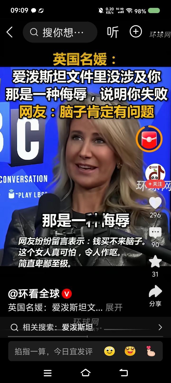 没上爱泼斯坦案文件的人,是失败者?—— 据报道,英国某女子说:“爱泼斯坦认识所有有权有势的人。如果你身处其中,说明你有权势。没有出现在文件上,说明你很失败。” 点评: 网友痛斥:“疯了!”“脑子有……” 我在想另一个问题,她真这么认为还是想引人关注?报道里说她是英国某王室成员的前女友。