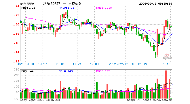 2月10日,消费50ETF(515650)开盘跌0.25%,报1.195元。消费50ETF(515650)重仓股方面,贵州茅台开盘涨0.00%,美的集团涨0.06%,五粮液跌0.17%,伊利股份跌0.18%,格力电器涨0.00%,牧原股份跌0.41%,海尔智家涨0.31%,中国中免跌0.36%,温氏股份涨0.00%,山西汾酒跌0.40%。