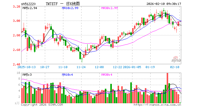 2月10日,TMTETF(512220)开盘涨0.10%,报2.989元。TMTETF(512220)重仓股方面,中际旭创开盘跌0.78%,新易盛涨0.52%,立讯精密跌0.06%,寒武纪涨1.67%,工业富联涨0.38%,中芯国际涨0.23%,海光信息涨1.90%,北方华创涨0.82%,胜宏科技跌0.50%,兆易创新跌2.00%。