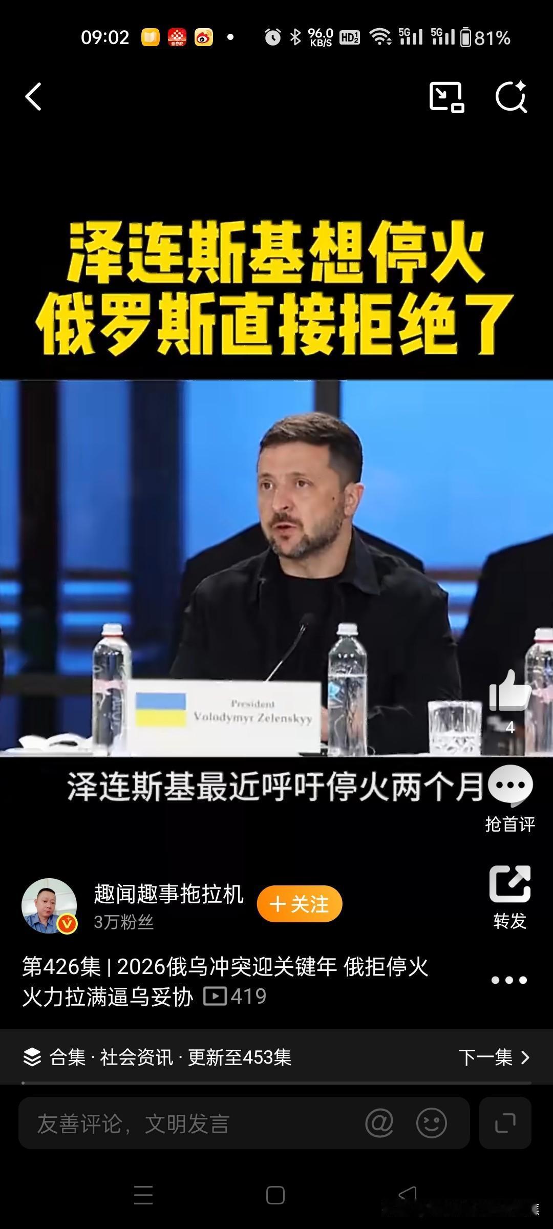 泽连斯基为什么拒绝和谈,不打了他就要下台,不打了就无法给西方要钱要援助了,这才是实质所在! 泽连斯基政府拒绝和谈的核心矛盾在于领土主权问题,俄方坚持要求乌克兰承认乌东四州及克里米亚归属俄罗斯,而泽连斯基认为割让领土涉及国家尊严和宪法底线,同时外部势力干预、国内民意压力及个人政治命运等多重因素交织,导致谈判陷入僵局。@红星新闻414红星新闻一泓溪语君趣闻趣事拖拉机 一、领土主权问题:不可逾越的红线 俄方的核心条件:俄罗斯明确提出和谈前提是乌克兰承认顿涅茨克、卢甘斯克、赫尔松、扎波罗热四州及克里米亚归属俄联邦,并要求乌克兰裁军、放弃进攻性武器。俄外长拉夫罗夫强调“实际控制线”是谈判基础,而乌方须接受“领土现状”。@央视网418 乌方的宪法底线:泽连斯基多次援引乌克兰宪法“领土不可分割”条款,声明绝不割让领土。2025年12月,他公开拒绝美俄提出的领土置换方案,强调“每一寸土地都浸透乌军士兵的生命”,让步将等同“叛国”。民调显示,超75%乌克兰民众反对割地止战。@一泓溪语君2427央视网俄乌网 二、外部干预:美欧博弈与援助捆绑 美国选举周期施压:美方设定2026年6月为停火最后期限,意图在中期选举前达成协议以提振选情。但特朗普政府被曝以“断援”威胁乌方让步,甚至讨论“更换亲俄领导人”方案。泽连斯基直言“美方更关注选举而非乌克兰命运”。@环球时报719 欧洲援助乏力与分歧:欧盟承诺的财政和军援实际到位率不足30%,德国仅兑现2.7亿欧元(承诺35亿),且78%用于偿还债务利息。英法德虽表态支持乌克兰主权,但无力填补美援缺口,导致乌方难以抗衡俄军攻势。@一个坏土豆1222环球时报看看新闻Knews满仓红不婷两仪生麻瓜一个坏土豆 三、国内政治与个人抉择 民意与执政合法性:战争初期泽连斯基支持率达69%,但随战局恶化(2025年乌东防线崩溃、电力系统损毁60%),支持率骤降至52%。若接受领土让步,可能引发执政危机。部分乌军部队因反对“自杀式防御命令”与政府决裂,加剧内部动荡。1239 “战争英雄”人设的双刃剑:泽连斯基通过战时领袖形象凝聚国内士气并获取国际声援,但该人设要求其保持强硬立场。分析指出,妥协将导致其政治资本崩塌,而拖延谈判可暂时维系西方援助与国内支持。133943财凌宝哨角 四、战场现实:筹码持续流失 俄军2025年投放5万枚制导炸弹,摧毁乌境内超60%电力设施,并持续扩大控制区(较2024年增加8%)。乌军弹药库存仅剩30天用量,155毫米炮弹仅为战前7%。战场劣势削弱了乌方谈判话语权,俄方更倾向“以打促谈”。3420 冲突本质:大国博弈的代理人困局 意大利媒体《反外交》指出,乌克兰已成为“北约新型武器试验场”,西方军工复合体通过延续战争攫取利益。泽连斯基政权依赖外援生存,被迫在“国家生存”与“西方代理人”角色间挣扎。俄方则指控美英操纵谈判进程,使乌方丧失独立性。@总台环球资讯1050 结语:泽连斯基的“拒谈”本质是主权危机下的生存策略。领土问题触碰历史责任与民族认同,让步可能引发政权崩溃;而美欧的短期利益导向使乌方陷入“战无胜算、和无尊严”的困局。真正的和平需大国放下地缘博弈,而非强压小国牺牲。32439灭蛙