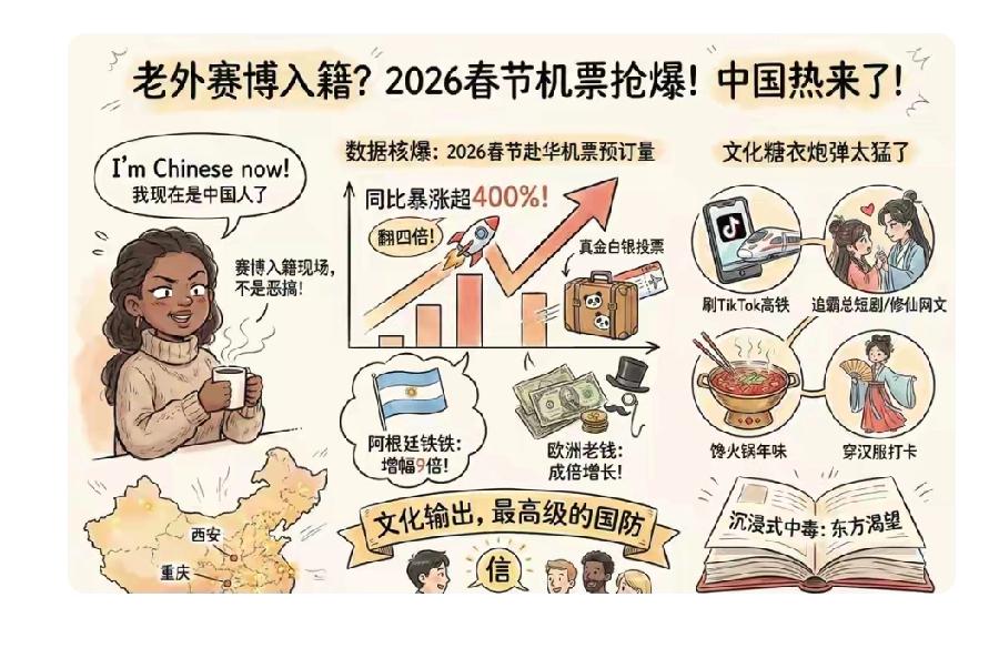 2026 年春节还没到,海外就掀起了一股“中国热”。金发碧眼的老外们在海外社交平台上疯狂刷屏中国春节,一边喊着“我要当中国人”,一边把春节来中国的机票抢到爆,国内各大口岸外籍旅客量大幅上涨。 他们抢的可不只是机票,而是体验咱们习以为常的生活。深夜街头灯火通明,一家人围坐吃年夜饭,这些在很多国家稀缺的“确定性”,在咱们这儿是日常。他们还沉浸式感受贴春联、放烟花、包饺子等年俗,比不少年轻人还懂规矩。曾经我们羡慕国外,如今咱们成了别人向往的诗和远方,这就是国家发展带来的底气!