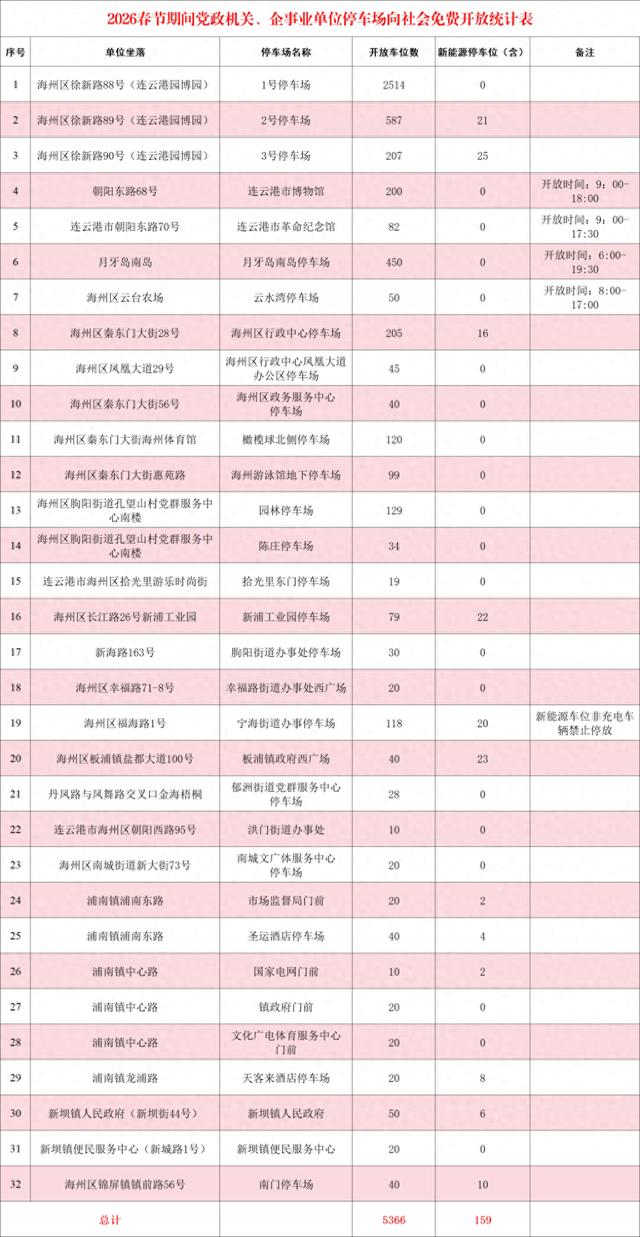 为缓解春节出行停车压力,海州区32处党政机关、企事业单位停车场同步开放,涵盖园博园1—3号停车场(共3308个车位)、连云港市博物馆(200个)、月牙岛南岛停车场(450个)、海州区行政中心停车场(205个)等重点区域(200个以下车位停车场未列出),其中包含159个新能源停车位(部分区域新能源车位仅限充电车辆停放)。部分停车场设有开放时间限制,如连云港市博物馆为9:00—18:00,月牙岛南岛停车场为6:00—19:30,具体以各停车场实际运营为准。