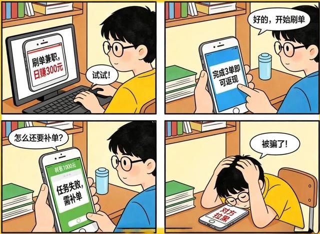 寒假想通过兼职赚取零花钱,是不少同学的假期计划,而刷单返利类诈骗正是瞄准这一需求,以高佣金为诱饵实施诈骗。