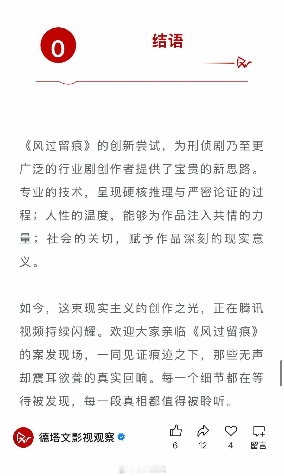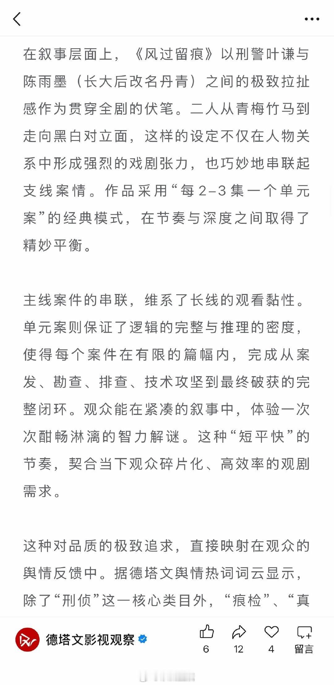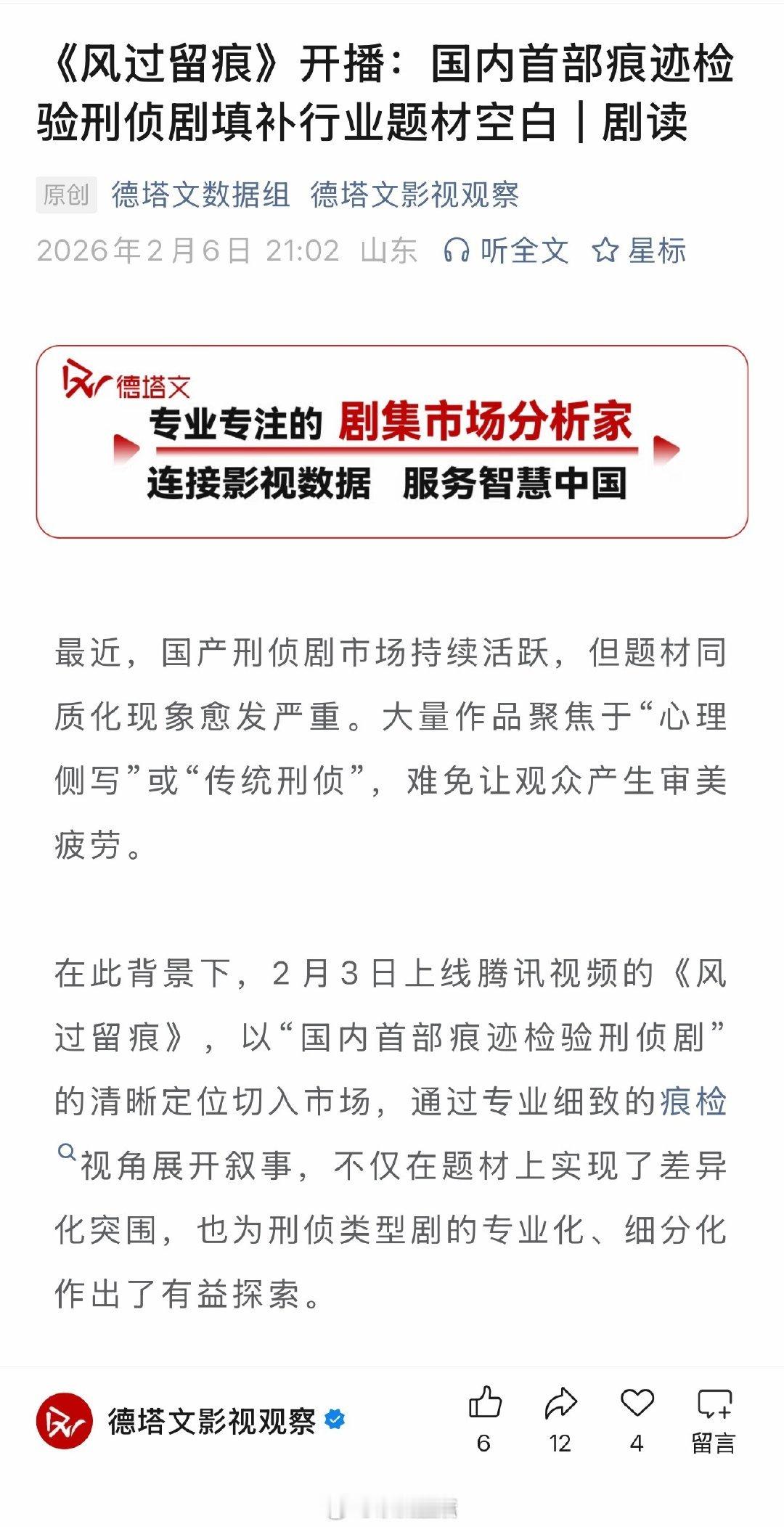 德塔文发文,《风过留痕》开播:国内首部痕迹检验刑侦剧填补行业题材空白