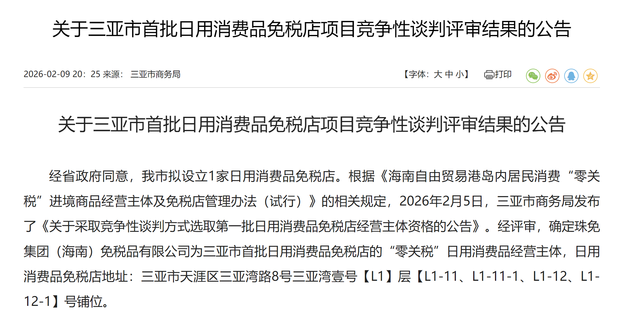上证报中国证券网讯(记者黎灵希)2月9日,三亚市商务局发布《关于三亚市首批日用消费品免税店项目竞争性谈判评审结果的公告》。当中提到,经评审,确定珠免集团(海南)免税品有限公司为三亚市首批日用消费品免税店的“零关税”日用消费品经营主体,日用消费品免税店地址:三亚市天涯区三亚湾路8号三亚湾壹号[L1]层[L1-11、L1-11-1、L1-12、L1-12-1]号铺位。