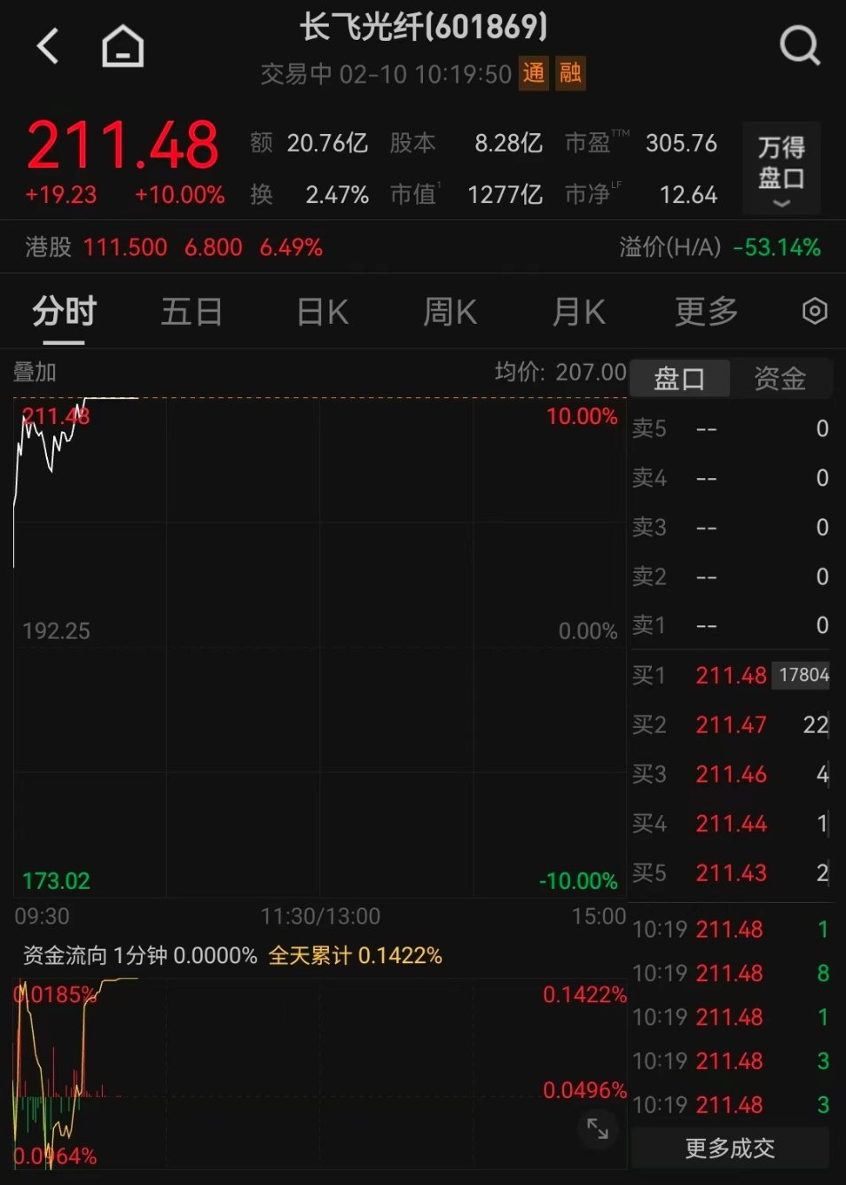 上证报中国证券网讯(记者郑维汉)2月10日,长飞光纤开盘后震荡走高至涨停,实现两连板,报211.48元/股。