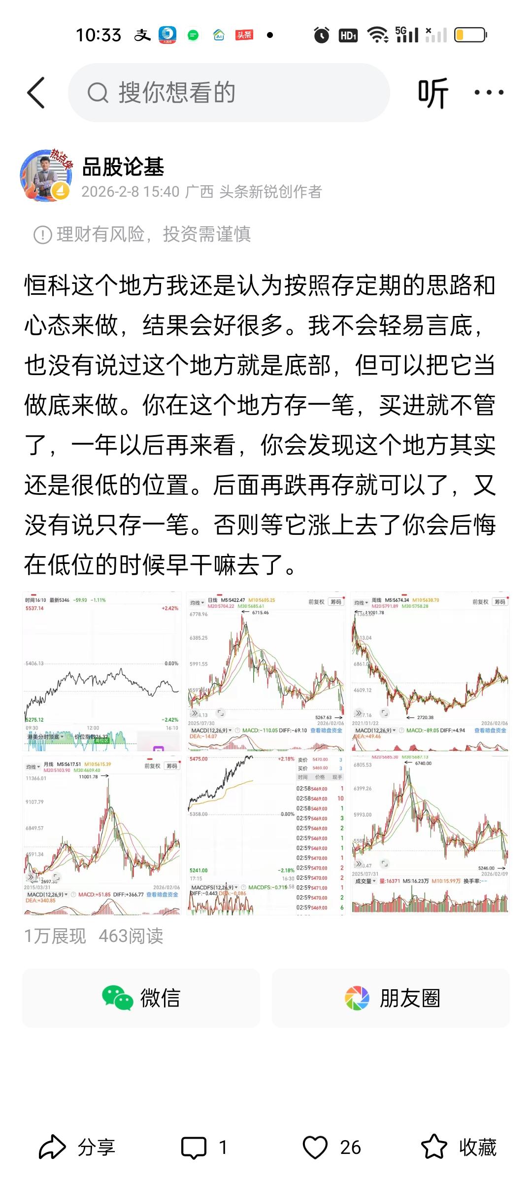 恒科前面在5267.63这个低点的时候,我就说过M+N次啊,你可以按照银行定期存款的思路来做它,买进去就不要管,不用管涨和跌。一年以后你再来看,肯定比存银行定期一年的收益率要高许多。至于买进去继续下跌怎么办?那你就再存一笔啊。银行存钱也可以一笔一笔存的不是吗?