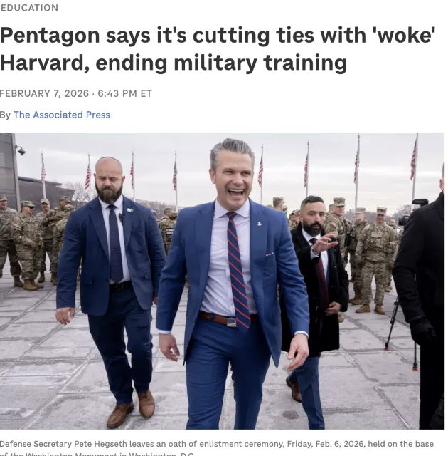 五角大楼周五宣布,将正式切断与哈佛大学的学术合作关系,终止所有与这所常春藤盟校相关的军事训练、奖学金及证书项目。这一决定被视为特朗普政府与哈佛大学长期对峙中的最新、也是迄今最激烈的一步。美国国防部长皮特·赫格塞斯(Pete Hegseth)在声明中直言,哈佛大学“已经不再满足战争部或美国军队的需求”。他说,多年来,国防部一直将“最优秀、最聪明的军官”送往哈佛深造,希望他们能更好地理解并尊重军队这支“战斗队伍”,但结果却事与愿违。“太多军官从哈佛回来后,变得太像哈佛了,”赫格塞斯表示,“他们的脑子里充斥着全球主义和激进思想,而这些并不能提升我们的战斗力。”