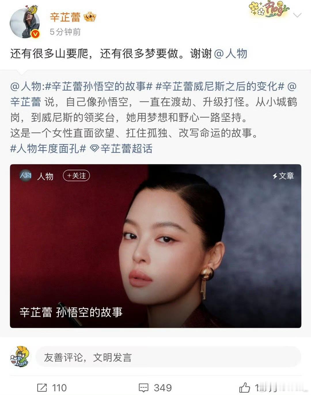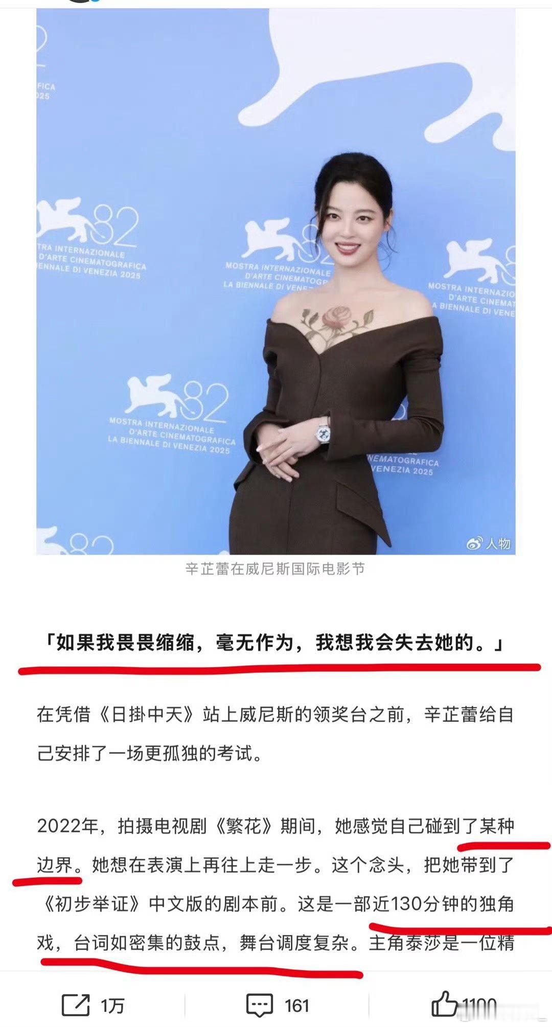 辛芷蕾如果我退缩我想我会失去它辛芷蕾威尼斯之后的变化辛芷蕾真的很清醒,所有成绩都是自己拼来的。她给自己打气:未来一片光明,路还长,山还多,梦还要继续做。辛芷蕾