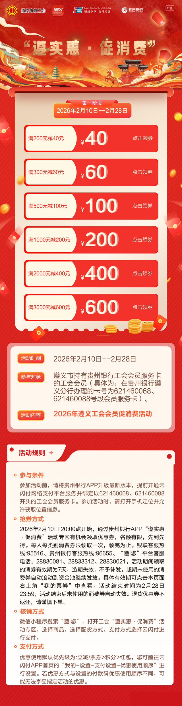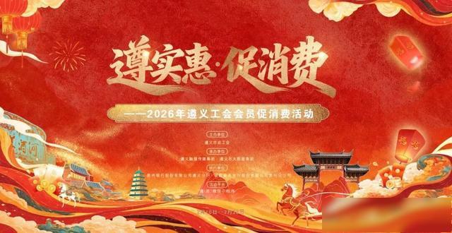为拉动消费增长、赋能本地企业,让职工享实实在在的优惠,营造“人人参与乐享消费”的节日氛围,遵义市总工会面向全市持有贵州银行工会会员服务卡的职工推出“遵实惠·促消费——2026年遵义工会会员促消费活动”,活动将于2月10日晚上8时正式启动,持续到2月28日24时。