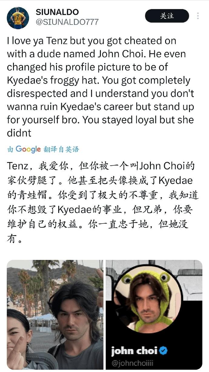 Tenz回应外网讨论Kyedae是否出轨:妄加猜测真是恶心