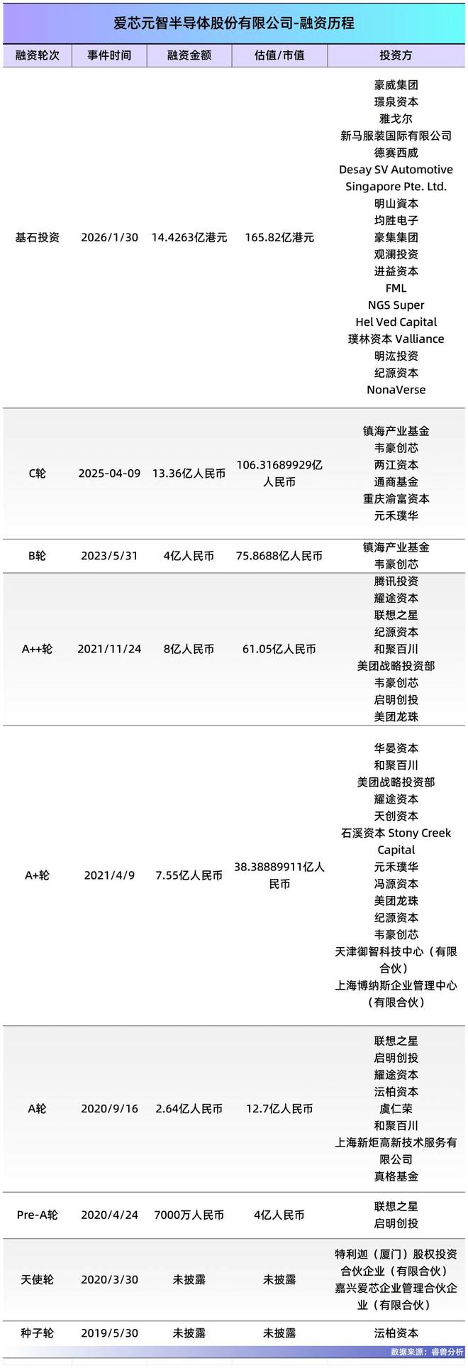 2024年4月至2025年5月,公司完成超13亿元C轮融资。前期,公司先发行三款合计2亿元的可换股债券,由韦豪三期、宁波镇海、重庆两江投资分别出资1亿元、0.5亿元、1亿元认购。