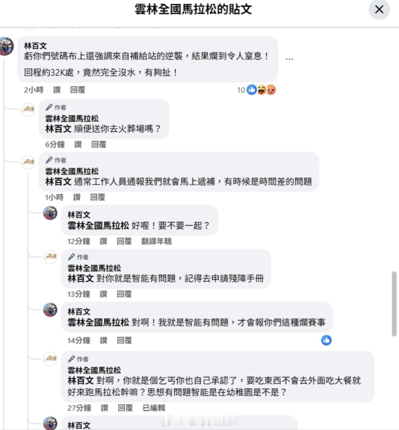 台湾云林马拉松小编大呛跑者。由于回复参赛跑者对赛事的差评言论过于出格,台湾云林马拉松的官号引起极大回响。稍后,赛事官号删除上述不当言论并发布道歉文,称该小编为在职最后一天,并将对该行为发起法律追究。