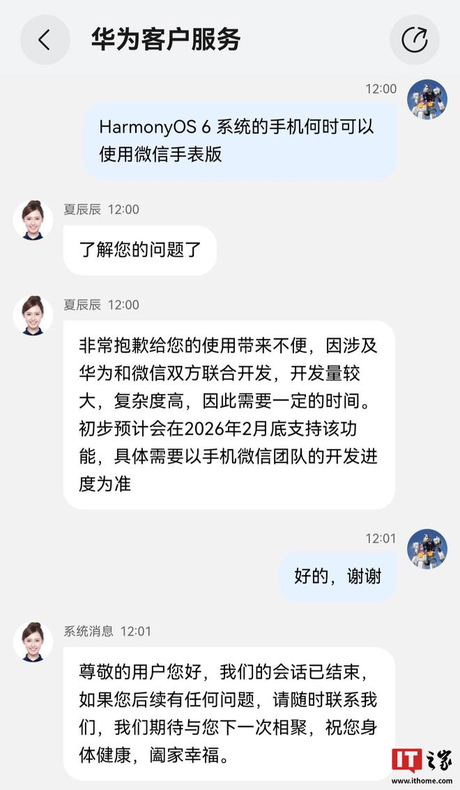 IT之家今日就HarmonyOS6系统的手机何时可以使用微信手表版这一问题询问了华为客户服务,对方表示: