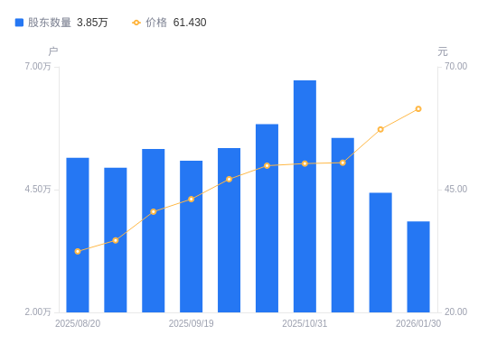日期A股户数(户)流通A股户均持股数(股)户均持股市值(万元)2026-01-303850616384.99100.652026-01-204434114228.8281.472025-11-285554611358.5257.342025-10-31672559381.0247.192025-10-105833710815.1053.942025-09-305346311801.0655.612025-09-195089012397.7353.392025-09-105328111841.3747.962025-08-294946812754.1144.212025-08-205146812258.5039.75