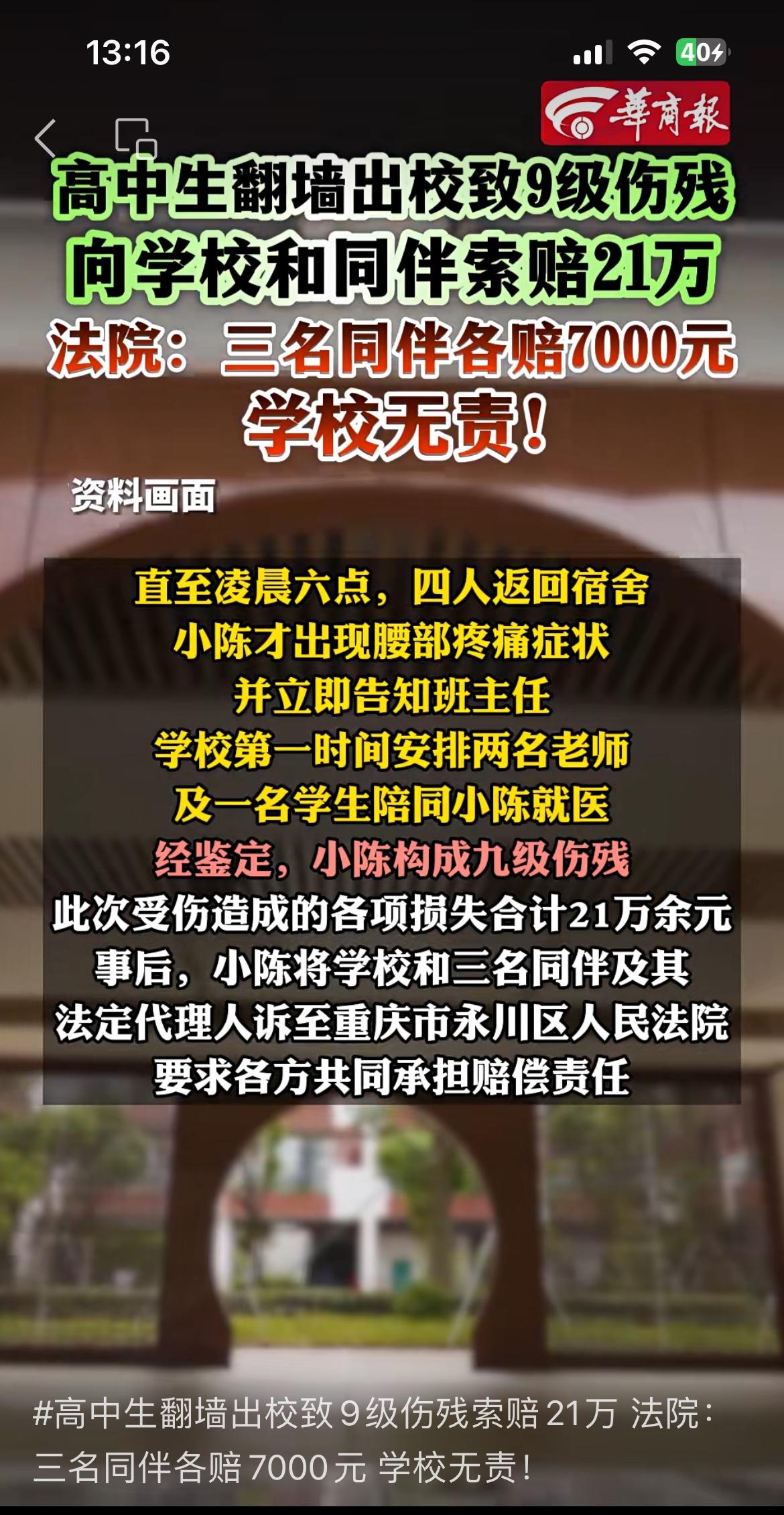 重庆高中生校园翻墙外出打台球摔伤,找学校和同行同学索赔21万。重庆永川某高中学生陈某某天晚上下晚自习后,和三个同学溜出寝室,翻墙去学校外面打台球,翻墙过程中陈某摔跤,当时不以为意,继续去打台球到第二天清晨,发现腰部疼痛加剧,才告知老师就医,检查发现9级伤残,花去医疗费21万多,家属很生气。把学校和同学一起告上法庭,要求他们承担损失。经过法院审理,三个同学每家掏了7000块,学校免责。三个同学为啥要承担责任,属实不明白。大学生坠楼事故