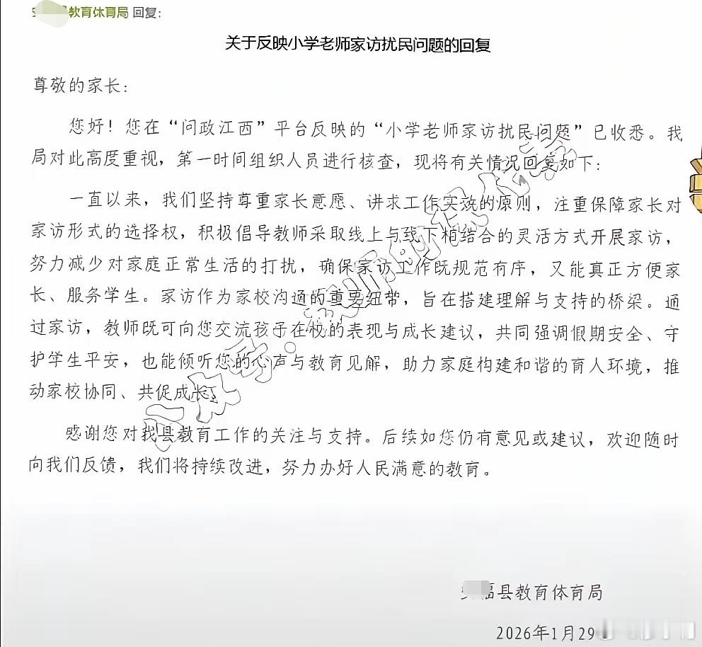 家长抱怨老师家访扰民 近日,江西某县一个家长,在当地网络问政平台发帖,向当地教育局投诉:“老师上门家访,除了扰民,根本没有什么现实意义!”
