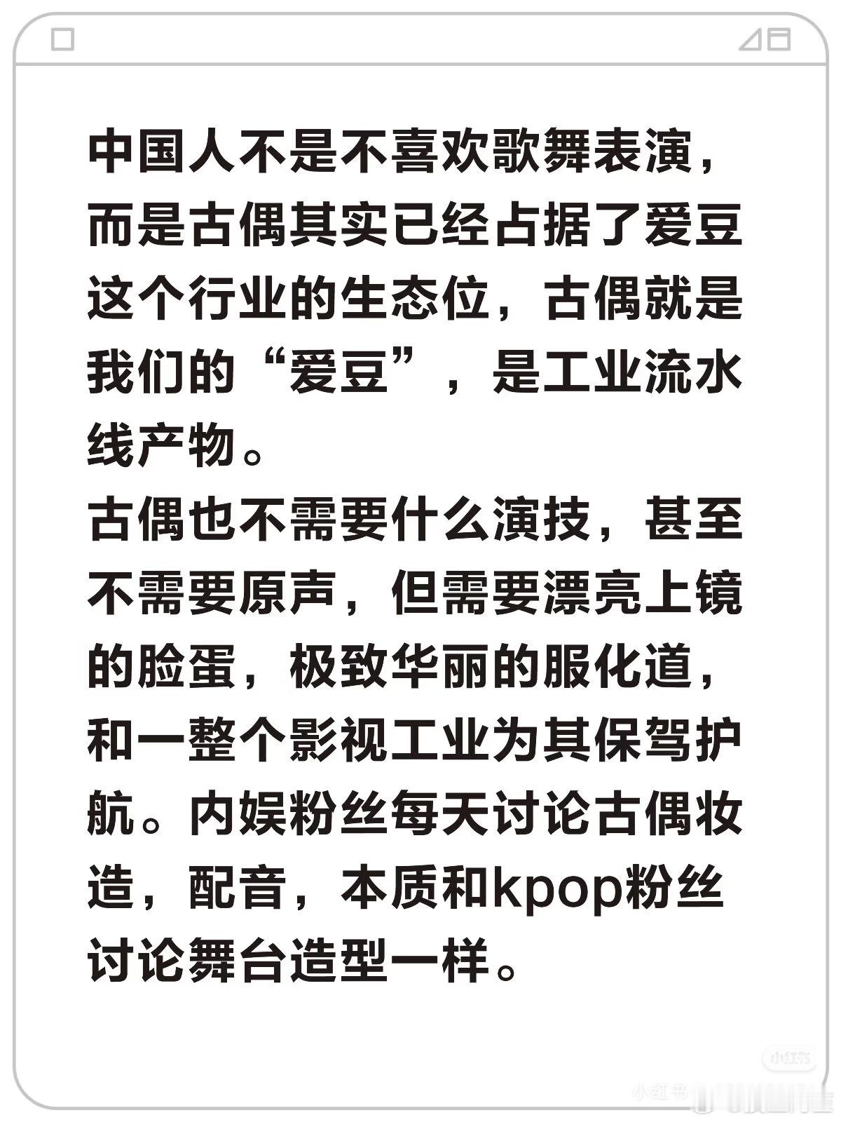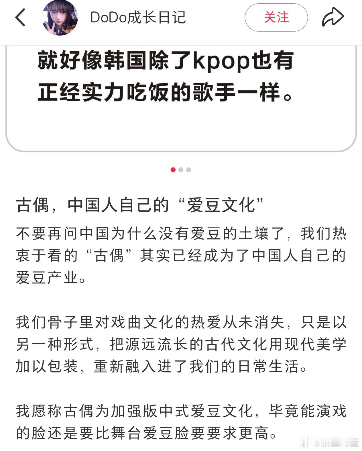 🍠人总结说古偶是中国自己的爱豆文化还挺有道理的……中国人就是喜欢看戏剧类的节目,所以到了现代,年轻艺人出道的方式就是演古偶,从古偶流量一步步往正剧艺人发展。