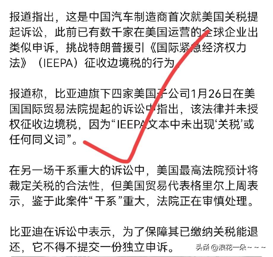 顶起来! 特朗普政府被比亚迪起诉了?! 据路透社报道,法庭文件显示,中国汽车制造商比亚迪已对美国政府提起诉讼,挑战美国总统特朗普动用广泛权力征收关税的举措,并要求退还自去年4月以来缴纳的所有关税。 可以看出,比亚迪公司这是拿起了美国的法律武器,来维护比亚迪公司的利益啊。 其实,特朗普政府的关税政策本来就是违法的,他是在没有经过国会同意的情况下,对其他国家的公司强行征税。 为此,到现在为止美最高法院还没有最终裁决出来呢?因为,一旦裁决特朗普政府违法,那不得不赔偿滥施关税给他国各企业公司所带来的巨大损失。 接招吧,特朗普政府,判你个违法以昭告天下。[捂脸]