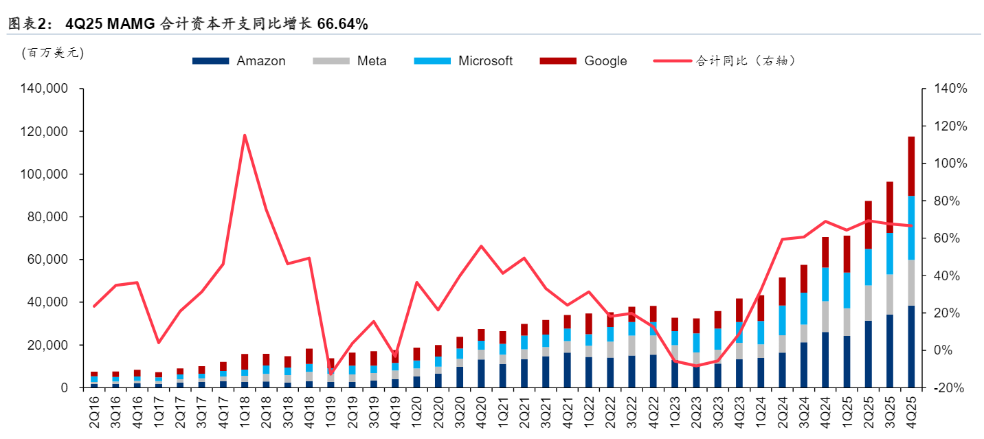 北美四大云厂商(MAMG,微软、亚马逊、Meta、谷歌)近日已发布25业绩,MAMG25年合计资本开支同比增长67.06%至3725.52亿美元,Factset一致预期26年资本开支将达到5707.67亿美元(同比+53.2%)。各家保持对26年资本开支的积极指引:1)微软预计2026年全年的资本支出约为1152亿美元;2)亚马逊预计2026年全年的资本支出约为1613亿美元;3)Meta预计2026年全年的资本支出约为1237亿美元;4)谷歌预计2026年全年的资本支出约为1705亿美元。