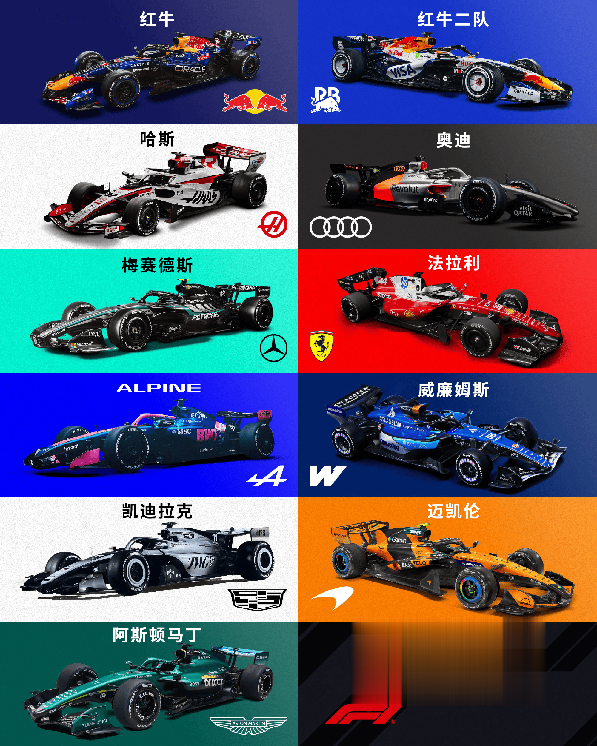 虎扑02月10日讯F1官方发布了新赛季11支车队的新车涂装合集,随着迈凯伦和阿斯顿马丁于昨晚发布新车涂装,所有2026新车均已经亮相,静候新赛季到来。