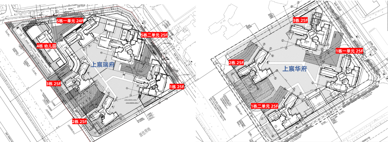 上宸瑞府因地块更大(2.19万㎡vs1.65万㎡),多出一栋“楼王”单元,采用一层三户设计,主打改善型大户型;而上宸华府四栋均为标准布局,1栋一单元和3栋为一层六户,更偏刚需刚改。