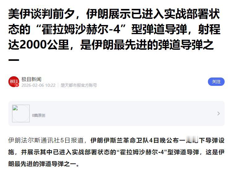 伊朗这回估计是真把东方智慧学进去了,美军要在波斯湾耀武扬威。却发现伊朗新型霍拉姆沙赫尔 4 型导弹,可以打击2000公里范围任何城市,1.5吨级战斗部,击中一座城市,其影响可能在数公里范围内造成毁灭性打击。 大家可能不知道,波斯湾对伊朗太重要了,美军也正是盯着这一点才总来闹事。波斯湾是全世界重要的石油通道,伊朗就靠这片海过日子,而美军常年在这儿驻军,一是想控制石油,二是想压制伊朗,不让它发展。 到2026年2月初,美军在波斯湾、阿曼湾一带摆了32艘左右的舰艇,还有航母、核潜艇,一副随时要动手的架势。 换以前,伊朗只能被动防守,可这次不一样,美军刚摆好阵势,伊朗就亮出了这款新导弹。 它不是样子货,是真能形成威慑的杀器,而且已经部署好了,就藏在伊朗的地下设施里,美军想轻易摧毁都难。 咱们说说这款导弹的真实情况,它是伊朗自己造的,核心优势就三个:射程、战斗部、速度,这三样加起来,美军想不重视都不行。 先说射程,它能打2000公里,整个中东地区的任何城市、美军在中东的所有军事基地,还有以色列全境,都在它的打击范围内。 以前伊朗的导弹打不了这么远,没法打到美军的要害,现在有了这款导弹,美军敢动手,伊朗就能直接反击。 再看战斗部,它有1.5吨重,威力特别大。简单说,只要它击中一座城市,不用打市中心,数公里范围内都会被夷为平地。 房子塌完、设施瘫痪,人员伤亡也会很惨重,美军的军事基地被击中,也会彻底报废。它既能装常规弹头,也能装核弹头,不管常规打击还是威慑,都能用。 最关键的是速度,它能达到16倍音速,一秒钟能飞5000多米,从伊朗发射,十几分钟就能打到以色列。 这么快的速度,再加上它下降时能变方向,美军的防空系统根本拦不住,而且它现在用的是中国的北斗导航,不容易被干扰,打得也准。 有人说伊朗吹牛皮,其实不是,这款导弹2023年就公布了,还试射过,2026年初又公开了部署设施, 证明它真能实战。不过要说它能击沉美军航母,就有点夸大了,伊朗目前还没能力精准打击移动的航母,但打固定的基地和城市,完全没问题。 伊朗这就是学了东方智慧,知道自己打不过美军,就不硬拼,专心造导弹,用最小的代价实现最大的威慑。 现在美军骑虎难下,继续挑衅怕被反击,撤走又丢面子。伊朗靠这款导弹,守住了自己的底线,也让全世界看到,弱国只要有实力、有智慧,就不会被强国欺负。