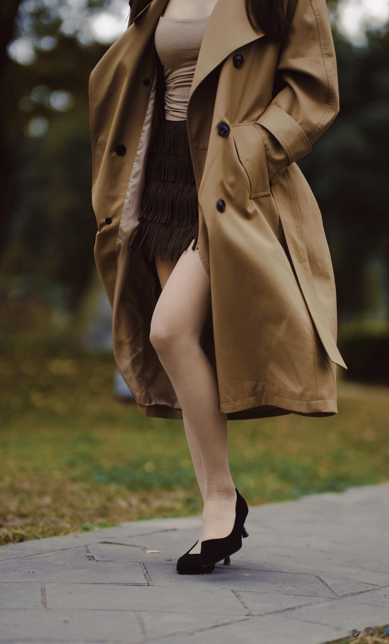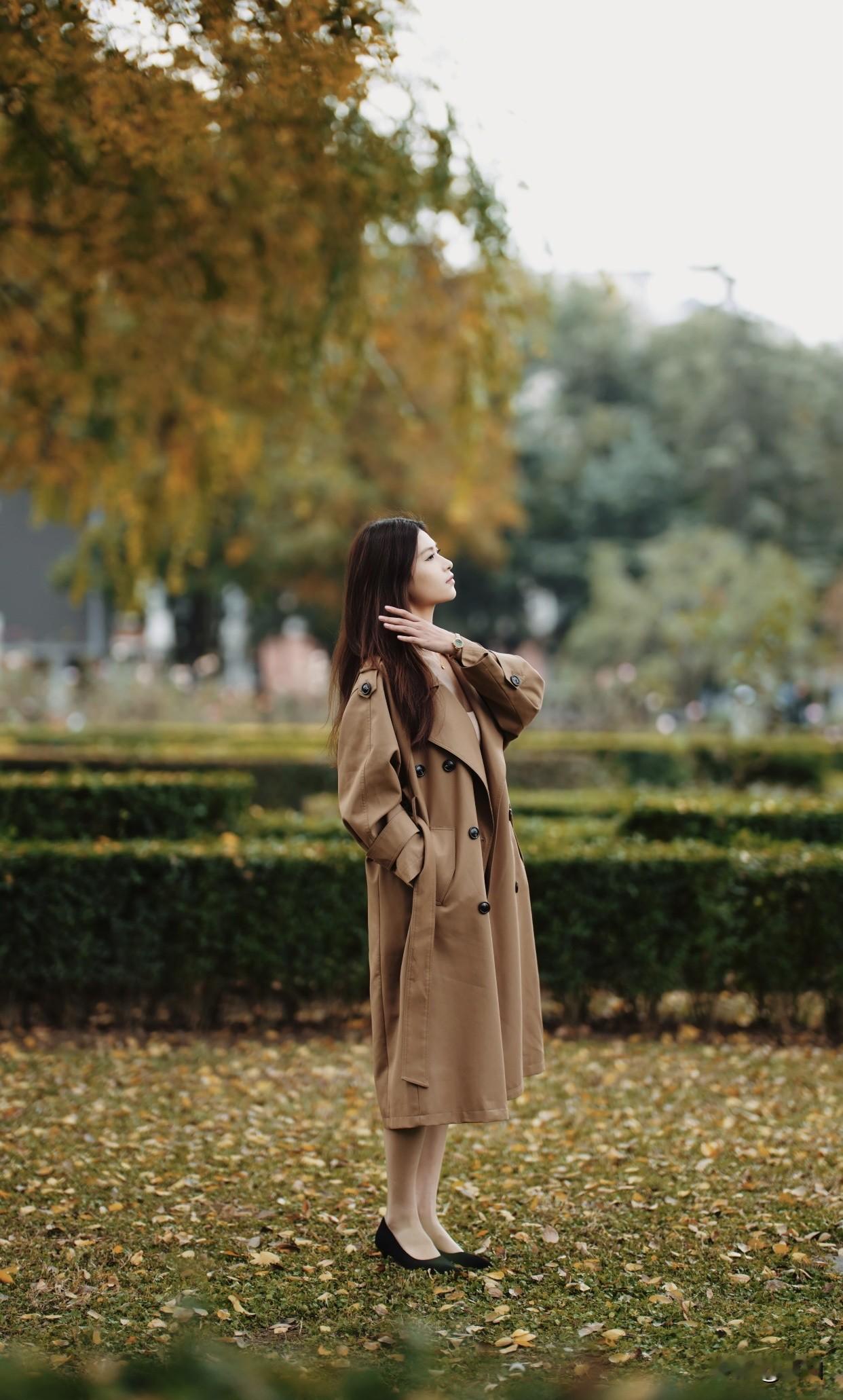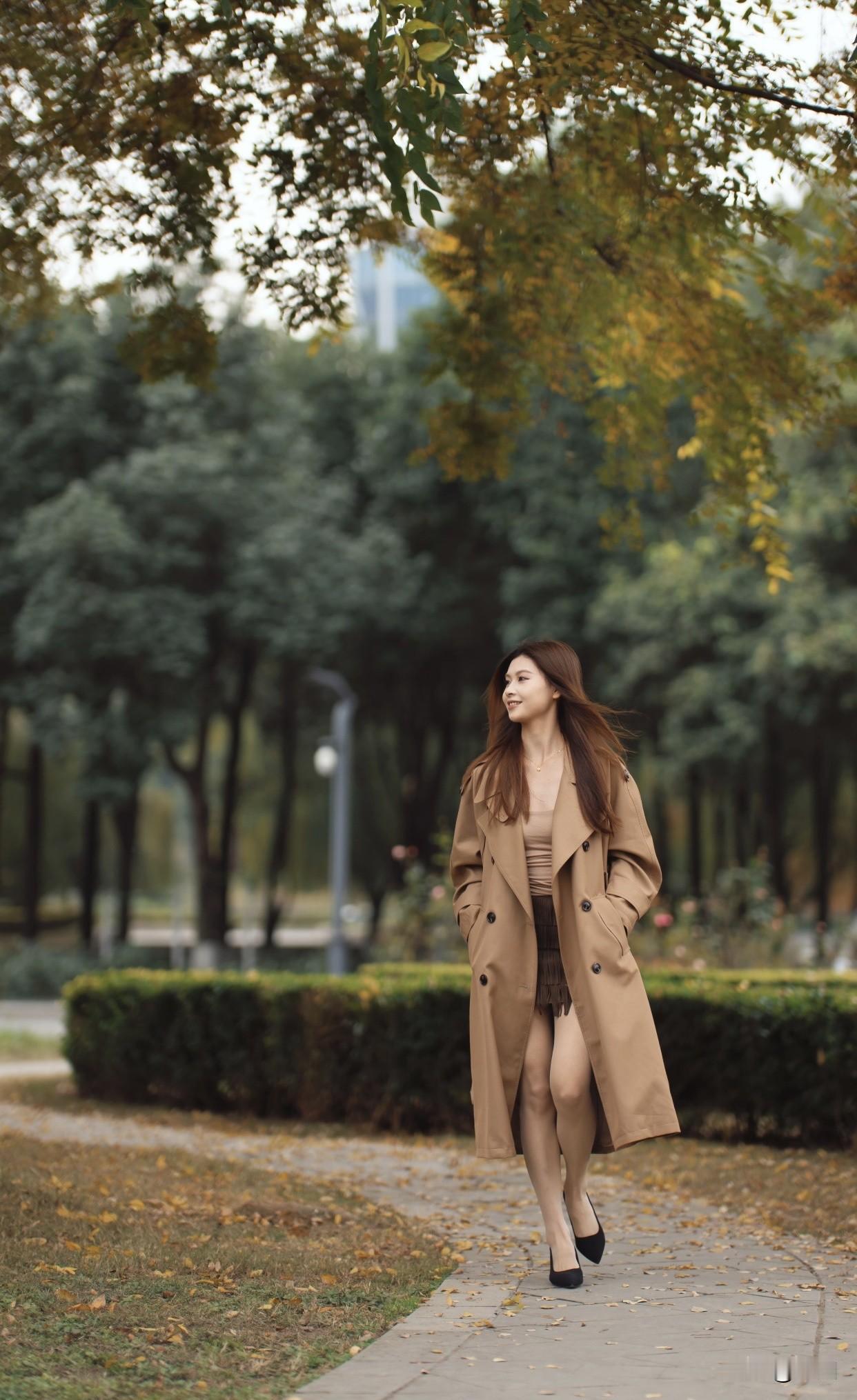 分享卓越的优雅女性秋日漫步,落叶飘零,优雅长风衣,感受自然之美。