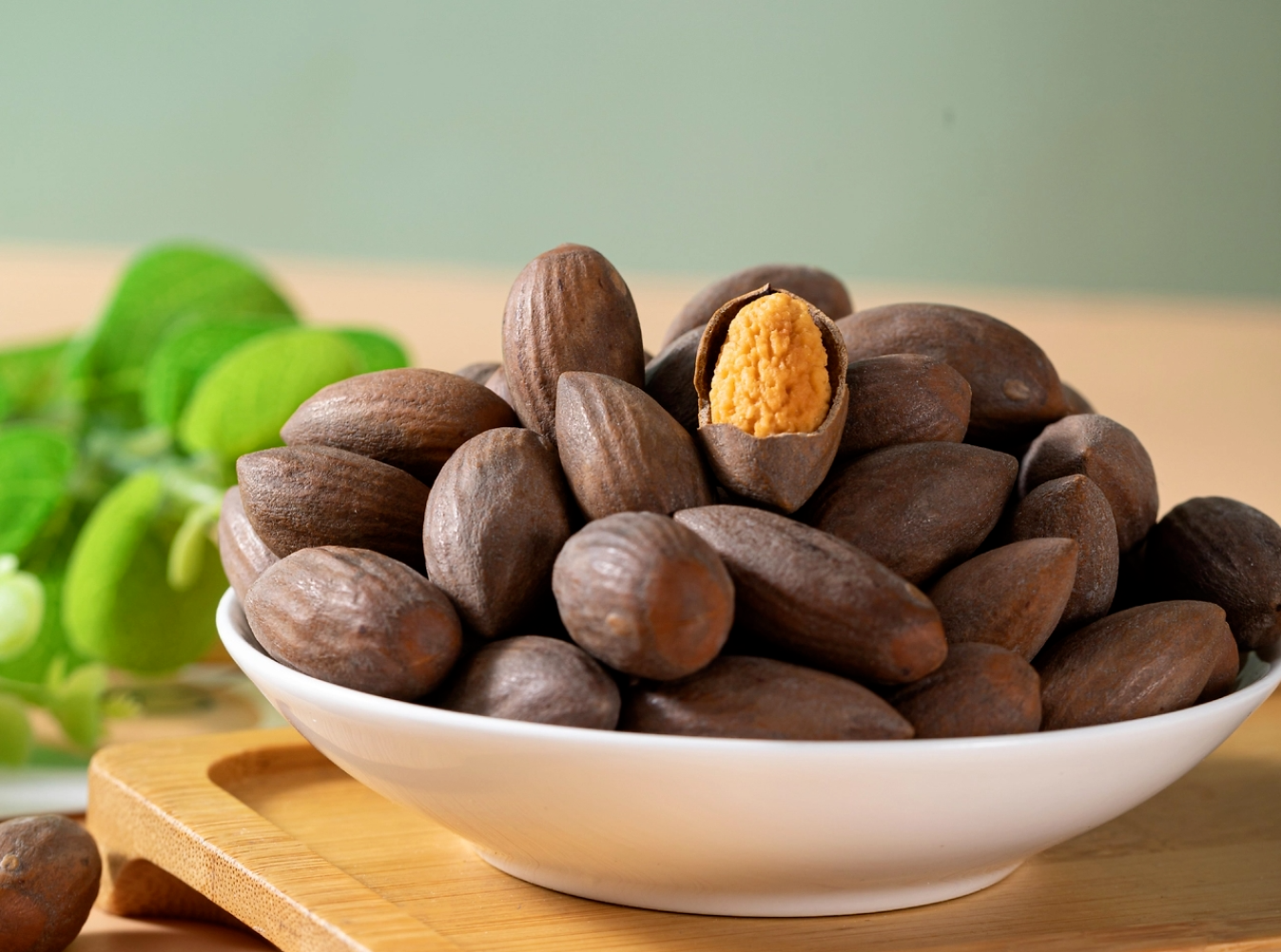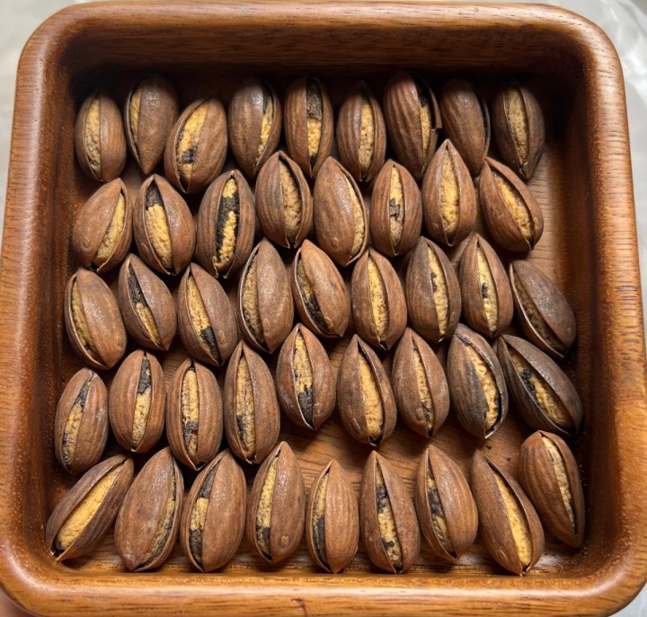相传,越王勾践曾尝试打开香榧榧壳但不得要领。美人西施用纤纤手指捏住榧壳上两个凸出的小小斑点,用拇指与食指轻轻一摁,榧壳瞬间裂开,露出完整的果仁,因此大家都称香榧的两个小凸点为“西施眼”。
