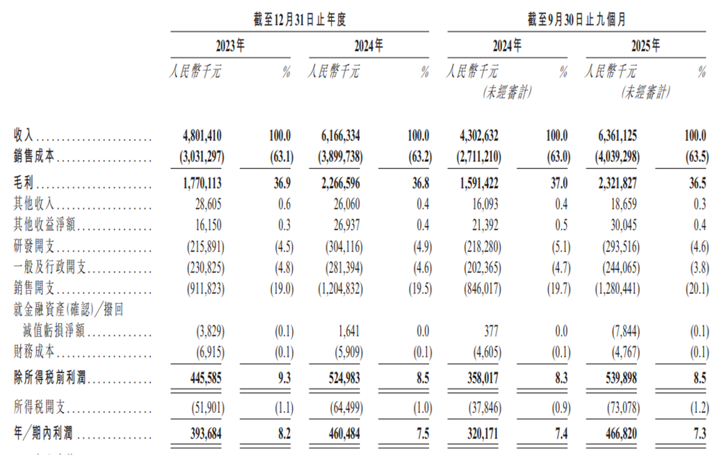 根据公司招股书,2023年至2025年前三季度,公司营收分别为48.01亿元、61.66亿元、63.61亿元,同比增幅25.1%、28.4%、47.8%;同期净利润分别为3.94亿元、4.60亿元、4.67亿元,增速为19.3%、17.0%、45.8%。然而,公司净利率却从2023年的8.2%下滑至2025年前三季度的7.3%。