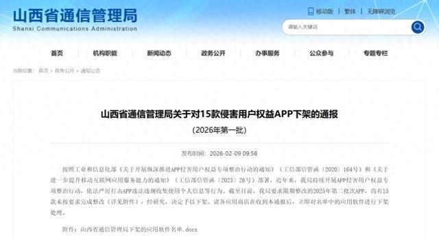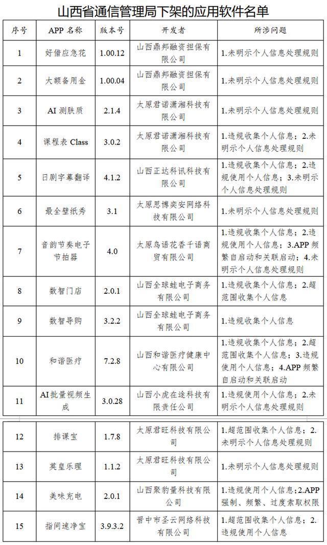 2月9日,山西省通信管理局通报下架15款侵害用户权益的App,涉及:“好借应急花”“大额备用金”“AI测肤质”“课程表Class”“日剧字幕翻译”“最全壁纸秀”“音韵节奏电子节拍器”“数智门店”“数智导购”“和谐医疗”“AI批量视频生成”“排课宝”“英皇乐理”“美味充电”“指间速净宝”。