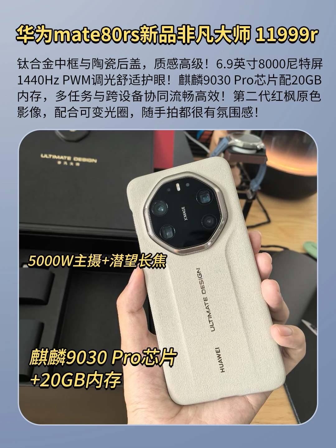 钛合金中框与陶瓷后盖,质感高级!6.9英寸8000尼特屏,1440Hz PWM调光舒适护眼!麒麟9030 Pro芯片配20GB内存,多任务与跨设备协同流畅高效!第二代红枫原色影像,配合可变光圈,随手拍都很有氛围感!
