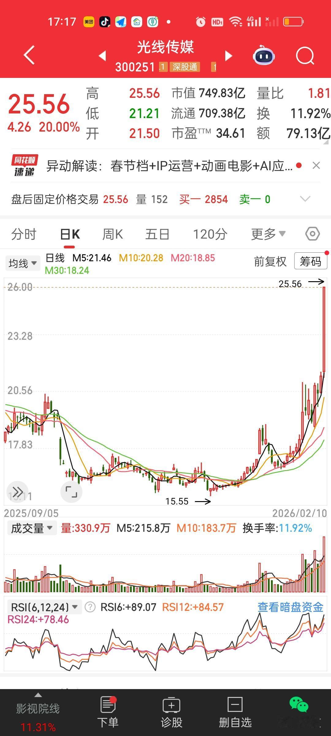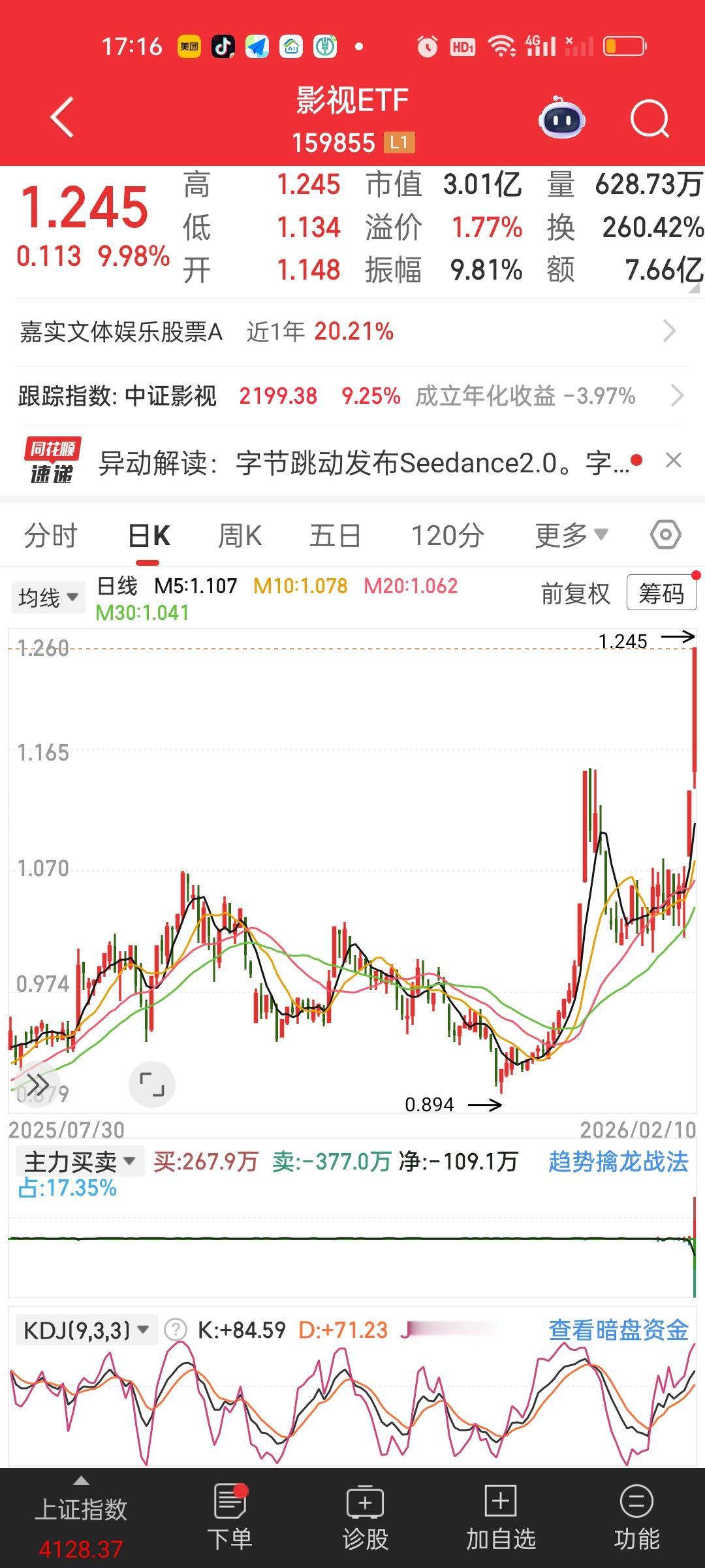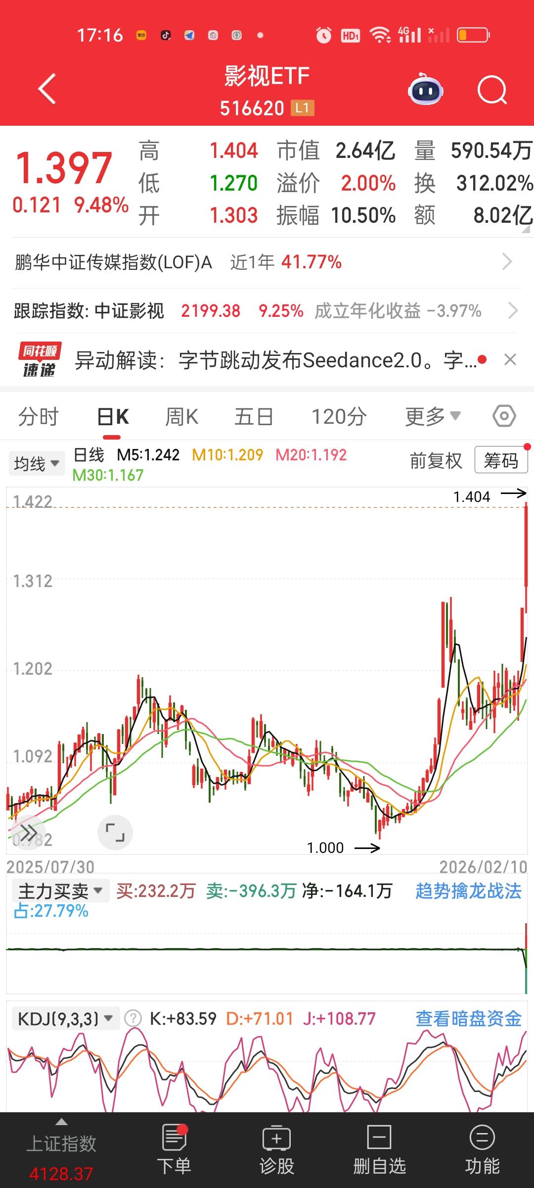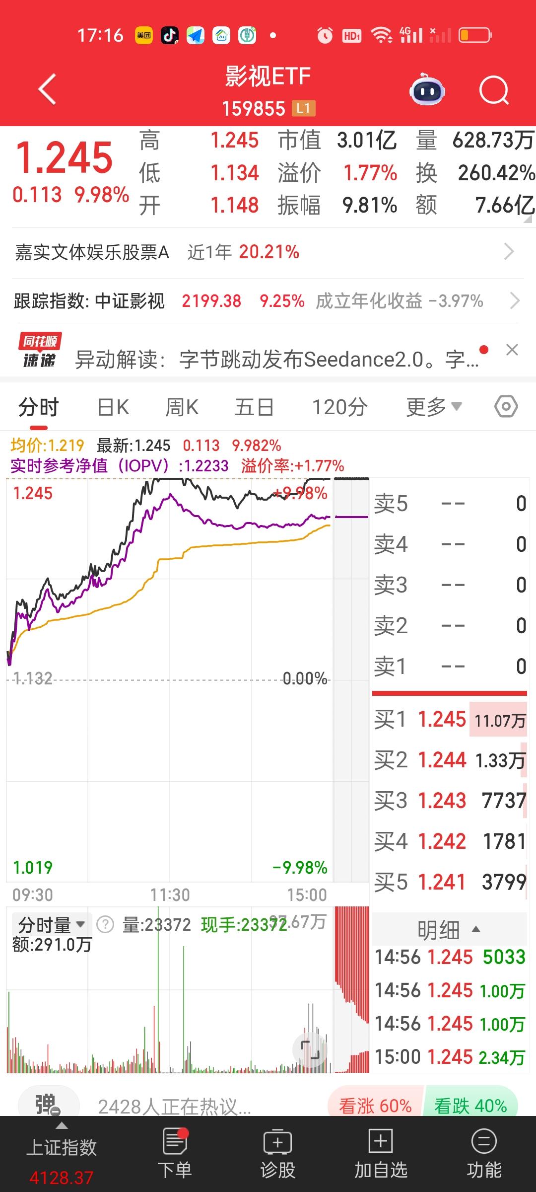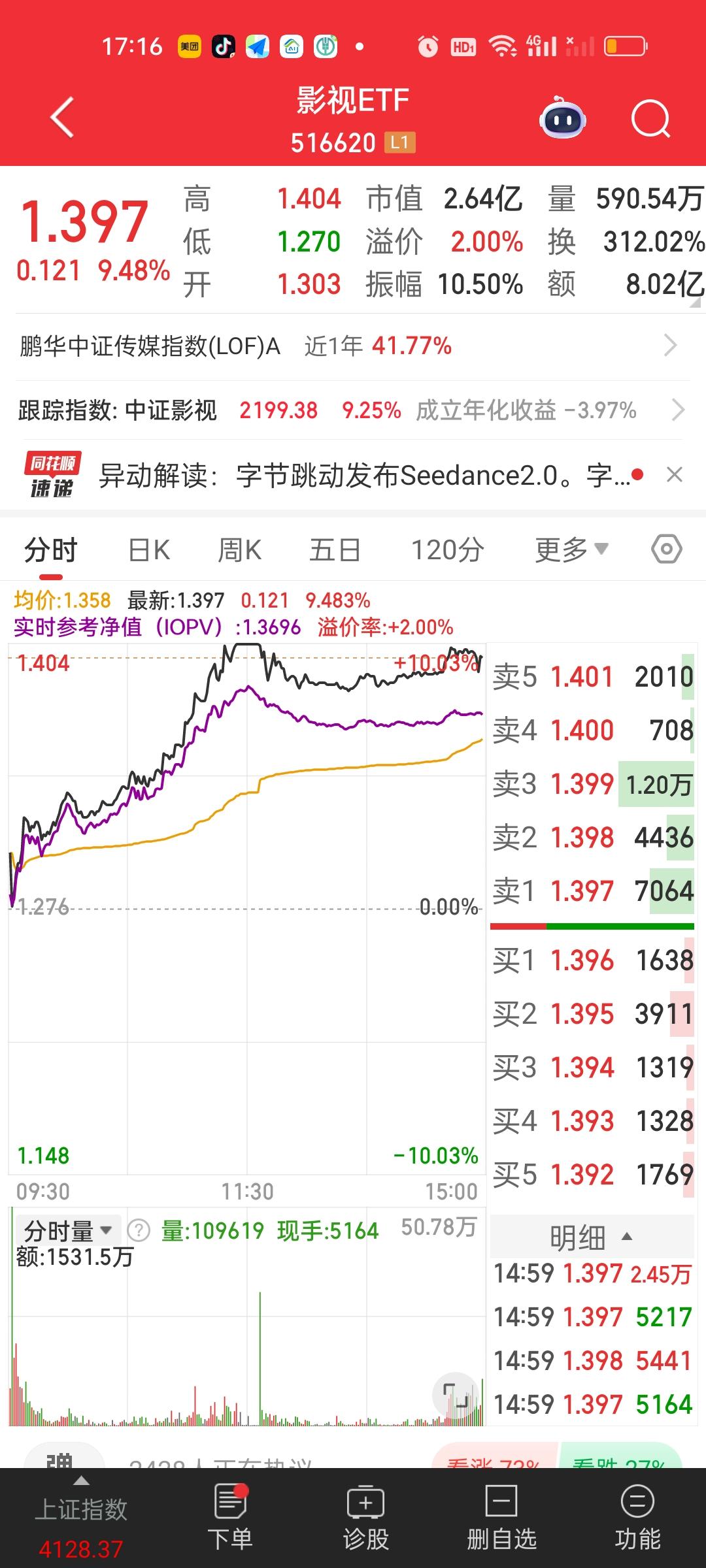 今天影视ETF直接涨停了,里面的个股光线传媒更是收获20厘米涨停。看来春节贺岁档电影票房预期很高啊。有资金在博弈。除影视ETF一骑绝尘之外,游戏传媒,日经225,港股通创新药,巴西,船舶,恒生生物科技,恒生医药涨得都不错,跌幅方面,地产,卫星,光伏,酒,科创板新能源,跌幅居前!